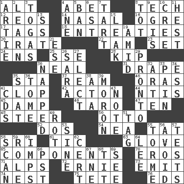 ACROSS 1. Keyboard modifier key 4. Collude with 8. Technician 12. Vintage cars 14. Relating to the nose 16. Legendary monster 17. Labels 18. Pleas 20. Feeling or showing extreme anger 22. Scottish cap 23. Arrange properly for use 24. Followers of ems 25. Compass dir. 28. Sleep 30. Actress Patricia 31. Window treatment 35. R.R. building 37. 480, 500 or 516 sheets of paper 40. Mouths or openings 41. Hoof sound 42. NE Massachussets city 44. Nuclear Threat Initiatives 45. Moist 46. Edible starchy tuberous root 47. Nine, plus one 48. Guide 50. "Beetle Bailey" pooch 52. Two (Sp.) 54. Teachers' org. 55. Make lace 58. Indian title of respect (Mr.) 61. Nervous spasm 63. Michael Jackson trademark 65. Pieces 70. Greek god of love 71. High mountains 72. Bert's buddy 73. Give off 74. A home for chicks 75. Wig 76. Begley and Asner DOWN 1. Nick name for Arthur 2. Acquire or gain knowledge or skills 3. Ancient Roman robes 4. One (Scot) 5. Forbid 6. Eastern Standard Time (abbr.) 7. Small pie 8. Small child 9. The front part of a cuirass 10. Algonquian 11. Behest 13. Fast jet (abbr.) 15. Path through which fluid escapes 19. Among 21. Compass dir. 26. "Two Mules for Sister ____" 27. Opt 29. Right away 30. Slept 32. Johnson of "Laugh-In" 33. Ache 34. Curvy letter 35. Narrow board 36. Heavy book 38. "One Day ___ Time" 39. Person of subnormal intelligence 41. Music discs 43. Short letter 49. Printing process, for short 51. Label 53. Trig term 55. Singer Mel 56. Keep away from 57. Trials 58. Examine hastily 59. Hero or heavy, e.g. 60. Naughty children 62. Sure thing 64. Area sheltered from the wind 66. Pacific Standard Time (abbr.) 67. Compass dir. 68. Teat (slang) 69. Observe