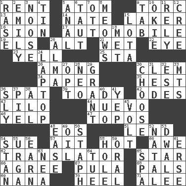ACROSS 1. Monthly bill 5. Tiny particle 9. Torque (variant) 13. Mine, in Marseilles 14. Nathan's nickname 15. Member of a famous L.A. basketball team 16. The Jewish people; Israel 17. Car 19. Raised railways 20. Keyboard modifier key 21. Soggy 22. Sight organ 23. Shout 25. R.R. building 26. Amid 30. Clement's nick name 34. Some stationery 35. Command 36. Argument over a trivial matter 39. Sycophant 42. Lyric poems 43. _ and Stitch 44. New (sp.) 46. Sharp bark 47. Literary convention 48. Greek goddess of the dawn 51. Grant temporary use of 54. Institute legal proceedings 57. Small island 58. Being at a high temperature 60. Deep reverence 62. Interpreter 65. Play the lead 66. Match 67. Monetary unit of Botswana 68. Friends 69. Nanny 70. Person who is morally reprehensible 71. Toward shelter DOWN 1. To erase 2. Poet Dickinson 3. Trap for birds or small mammals 4. Metal container 5. Of or related to the anus 6. Tense 7. Baseball player Mel 8. Catcalls? 9. Keyboard key 10. Migrant worker of the '30s 11. Depend 12. Algonquian 15. Globular water bottle used in Asia 18. Was introduced to 20. _ mater 24. Portable computer 27. Elect 28. Modern: prefix 29. Let have 30. Opt 31. Directed 32. Compass dir. 33. Mountains (abbr.) 36. Mischievous 37. Sliced dessert 38. 100% 40. Superhero pair 41. Slangy assent 45. Electrical Unit 48. Relaxation 49. Lubricate 50. Staphylococcus 52. Relating to or accompanying birth 53. A sleeping potion; an opiate (poet.) 54. Comedian Laurel of Laurel & Hardy 55. Capital and largest city of Mongolia 56. Merit 58. Opening into or through something 59. Taken by mouth 61. Celtic language 63. Teachers' org. 64. Third day of the wk. 65. Health resort