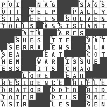 ACROSS 1. Luau course 4. Tired old horse 7. Settles 11. Baseball player Mel 12. Sharp bark 13. Chummy 14. R.R. building 15. Snakelike fish 16. Finds the solution 17. For Whom the Bell _____ 19. Aide 21. _ moment's notice (2 wds.) 23. Ancient Greek god of war 24. "______ My Girl" (Turtles hit) 25. Make a knot 26. Large container 29. Father Junipero _ 30. Followers of ems 31. In the manner of 32. Ocean 33. Ingest 34. Small bed 35. Layer 36. Armed conflict 37. Come out of 40. Double-curved letter 41. ___ a Wonderful Life 42. US Secretary of Labor Elaine L. _ 43. Old wives' tales, e.g. 45. Ewer handle 46. Dwelling 51. Ransack; plunder; pillage 55. Speaker 56. Wrote a lyric poem 58. To free from 59. Carrier 60. Lubricates 61. Single 62. SW Saudi Arabia district 63. French article 64. Commissioned mil. rank DOWN 1. Mail 2. "Beetle Bailey" pooch 3. Slanted text style (abbr.) 4. Born 5. Silent film actress Nazimova 6. Global Positioning Systems (abbr.) 7. Table seasonings 8. Inventor's middle name 9. Small, secluded valley 10. System (abbr.) 12. Next before 13. Airs 16. Male parents of animals 18. Cowardly lion portrayer 20. Virtuous person 22. White ___ sheet 24. Actors Connery and Penn 25. Separates forcefully 26. In a vacuum (with "in") 27. Medicinal plant 28. Make lace 29. Perceives with the eye 32. A female animal or person 33. Consumed 36. One who wires 37. Frozen water 38. Pottery fragments 39. Indian skirt 43. 61 cubic inches 44. Scent 46. Round or rotation of duties 47. Greek god of love 48. Suttee (variant) 49. Calm and collected 50. Singer Brickell 52. Toadlike animal 53. Actor's bit 54. Locale of original sin 57. Raised railways