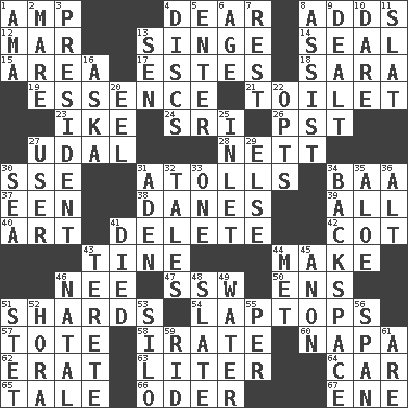 ACROSS 1. Electrical Unit 4. Letter starter 8. Sums up 12. Make imperfect 13. Scorch 14. Lick closed 15. Length times width 17. _____ Park, CO 18. "Two Mules for Sister ____" 19. Gist 21. Bathroom 23. Mamie's mate 24. _ Lanka 26. Pacific Standard Time (abbr.) 27. Allodial 28. Remaining after all deductions 30. Compass dir. 31. Ringlike coral islands and reefs 34. Sound made by sheep 37. Car or cant ending 38. Natives or inhabitants of Denmark 39. Everything 40. Tate display 41. Erase 42. Small bed 43. Prong on a fork 44. Create 46. Born 47. Compass dir. 50. Followers of ems 51. Pottery fragments 54. Portable computers 57. Carryall 58. Feeling or showing extreme anger 60. California wine valley 62. Part of Q.E.F. 63. 61 cubic inches 64. 4-wheeled motor vehicle 65. Falsehood 66. River in Europe 67. Compass dir. DOWN 1. Nanny (var.) 2. Female horse 3. Elected leader of a country 4. Flat circles 5. Keyboard key 6. Ripen 7. Remainder 8. Aid 9. Started a card game 10. Have the gumption 11. Narrow board 13. Elected rep. 16. "____ silly question..." 20. Snakelike fish 22. Chooses 25. An arm off of a larger body of water 27. One who uses or employs something 29. Otherwise 30. Ocean 31. An important port of Yemen 32. Falsehoods 33. Single 34. Keyboard key 35. _ vera 36. The first octave above the treble staff 41. Passed on 43. Cylindrical with tapered ends 44. Was introduced to 45. Soon (poet.) 46. Brizilian seaport 48. Schedule 49. Wetness 51. Proofreading order 52. Israeli folk dance 53. Grain storage tower 55. For each 56. Connect, as a bridge 59. To free from 61. "We ___ not amused" (Victoria)