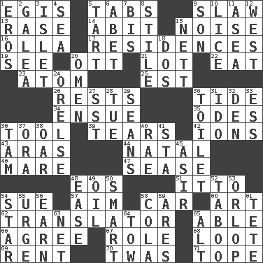 ACROSS 1. The front part of a cuirass 5. Bar bills 9. Cole _ (cabbage dish) 13. Raze (variant) 14. "This won't hurt ____!" 15. Annoying sound 16. Spanish pot 17. Dwellings 19. Observe 20. Baseball player Mel 21. Car dealer's back yard 22. Consume 23. Smallest unit of an element 25. Eastern Standard Time (abbr.) 26. Musical pauses 30. Event that recurs at intervals 34. Take place subsequently 35. Lyric poems 36. Implement 39. Pulls apart 42. Charged atoms 43. Caspian sea tributary 44. Relating to or accompanying birth 46. Female horse 47. Gospel singer Marvin 48. Greek goddess of the dawn 51. "Tell ____ the Marines!" 54. Institute legal proceedings 57. Direct toward a target or goal 58. Auto 60. Nonscientific branch of learning 62. Interpreter 65. Competent 66. Match 67. Hero or heavy, e.g. 68. Spoils 69. Monthly bill 70. It was, poetically 71. Drink excessively DOWN 1. Greek god of love 2. An organ shaped like a helmet 3. Small island 4. Ocean 5. Small pie 6. Collude with 7. Altar cloth linen 8. Vertical member of a panel or frame 9. Male child 10. Louse (plural) 11. At sea 12. Compass direction 15. Remaining after all deductions 18. Two (Sp.) 20. Sign of something about to happen 24. Threatening words 27. Fast jet (abbr.) 28. Third day of the wk. 29. Seines 30. Bathroom plumbing fixture 31. Wedding promise 32. Lair 33. Curvy letter 36. Scottish cap 37. Mouth or opening 38. Rowing implement 40. Actress Charlotte 41. R.R. building 45. SW Saudi Arabia district 48. Relaxation 49. Petroleum 50. Don Adams' spy role 52. Off limits 53. Fourth or lowest deck 54. Play the lead 55. Goad 56. Merit 58. Root beer relative 59. Ancient Greek god of war 61. Wig 63. Fish or hair follower 64. Pull behind 65. The first octave above the treble staff
