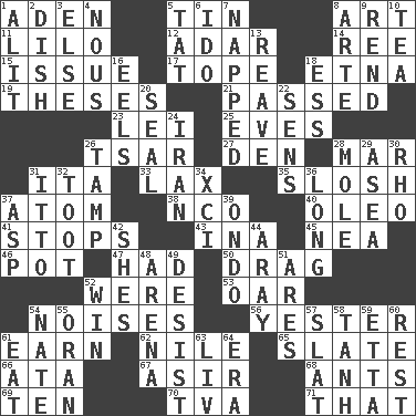 ACROSS 1. Arabian gulf 5. Shallow baking pan 8. Nonscientific branch of learning 11. _ and Stitch 12. The sixth month of the Jewish calendar 14. Portuguese money of account (variant) 15. Come out of 17. Drink excessively 18. Inactive volcano in Sicily 19. College papers 21. Went by 23. Luau accessory 25. Nights before holidays 26. Russian ruler of old 27. Lair 28. Third mo. 31. Call ___ day 33. Not strict 35. Agitate, as a liquid 37. Smallest unit of an element 38. Non-commissioned officer (abbr.) 40. Butter sub 41. Obstructs or blocks passage 43. _ tizzy (2 wds.) 45. Teachers' org. 46. Plant holder 47. Possessed 50. To draw with force 52. We are 53. Boat paddle 54. Annoying sounds 56. Of or pertaining to yesterday 61. Merit 62. The longest river in the world 65. Chalkboard 66. "One Day ___ Time" 67. SW Saudi Arabia district 68. Pismires 69. "___ Little Indians" 70. Federal power corp. 71. Not this but _ DOWN 1. Came down and settled, as after flight 2. Food container 3. Otherwise 4. Good sense 5. Make lace 6. Wedding promise 7. Slept 8. Johnson of "Laugh-In" 9. Tear apart 10. Afternoon social gathering 13. Rob, plunder, or pillage 16. Snakelike fish 18. Double-curved letter 20. Lick closed 22. Elected reps. 24. SW Asia republic 26. Pack (down) 28. Undercover agent 29. Toward the sea 30. 17th letter of the Greek alphabet 31. "Tell ____ the Marines!" 32. A blast of a horn 34. One more than ninety 36. Yearn 37. Cleo's killer 39. Southwest Nigerian state 42. "______ My Girl" (Turtles hit) 44. Like ___ of sunshine 48. Sports stadium 49. Cease 51. Ancient Greek god of war 52. Victory 54. Nathan's nickname 55. Northwest Algerian city 57. Narrow board 58. Hyperbolic tangent 59. Singer James 60. State of inaction 61. Ingest 63. 54 in ancient Rome 64. Epoch