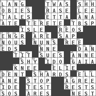ACROSS 1. Austrian-born American filmmaker Fritz 5. It was, poetically 9. Quiet! 12. Off-Broadway awards 14. Raze (variant) 15. Area sheltered from the wind 16. Lies 17. Singer James 18. Santa ___, CA 19. Had dinner 20. Cylindrical with tapered ends 23. Cook's measure (abbr.) 24. Small island 25. Vintage cars 27. Engineer (abbr.) 30. "We ___ not amused" (Victoria) 32. Plant excrement 33. Common sense 34. Religious women 36. Portuguese money of account (variant) 38. Begley and Asner 39. Compass dir. 40. Daniel's nick name 43. Teat (slang) 46. Takes to court 48. Singer Murray 49. Like a shrinking violet 51. Wedding promise 52. Greek goddess of the earth (variant) 53. Leg joint 54. Writer Wiesel 56. Gouge 58. Broken pieces 61. Pipe bend 64. A saturated hydrocarbon 65. Obstruct or block passage 66. Match 68. Binary compound 69. Trial 70. Musical pauses 71. Distress signal 72. Ancient Greek god of war 73. Egg locale DOWN 1. Globular water bottle used in Asia 2. Blind as ____ 3. "Death on the ____" 4. Turn to the right 5. Family _ (genealogy) 6. Electrical Unit 7. Michaelmas daisies 8. Ocean 9. Broad, flat, thick pieces 10. Coop moms 11. Pile 13. Fast planes 21. Enthusiasm 22. Summer TV shows 23. Drink excessively 24. Big collection agency 26. Hearing organ 27. Compass dir. 28. Allow head to fall sleepily 29. Abrupt rush of wind 31. World-weariness 35. Sowing specialist 37. Pulitzer Prize-winning author Ferber 41. Black tropical American cuckoo 42. Teachers' org. 44. Is not 45. Definite Article 47. Disposed of to a purchaser 48. Mature 50. Of or pertaining to yesterday 53. Leg joints 55. Austrian river, tributary to the Danube 56. Raised platform 57. Inside; within (prefix) 59. Stockings 60. Flats, for short 61. Celtic language 62. Allows 63. For fear that 65. R.R. building 67. Commissioned mil. rank