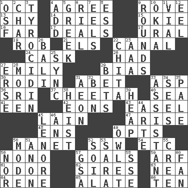 ACROSS 1. Sep. follower 4. Match 9. Be footloose 13. Like a shrinking violet 14. Frees from moisture 15. Migrant worker of the '30s 16. At a great distance 17. Allots cards 18. Mountain range 19. Director Reiner 21. Raised railways 22. Lessep's creation 24. Keg 26. Possessed 27. Poet Dickinson 29. Prejudice 30. "The Thinker" sculptor 31. Collude with 33. Viper 36. Indian title of respect (Mr.) 37. Leopard's kin 40. Ocean 41. Car or cant ending 42. Immeasurably long periods of time 43. Artist's stand 45. (Had) reclined 47. Ascend 48. Followers of ems 49. Elects 50. French painter Edouard 52. Compass dir. 54. And so on (abbr.) 56. Words to Nanette 57. Purposes of endeavors 59. Sandy's bark 61. Aroma 62. Male parents of animals 63. Teachers' org. 64. French philosopher Descartes 65. Having winglike extensions 66. "___ Little Indians" DOWN 1. Order of Saint Francis (abbr.) 2. Burn to charcoal 3. Polypeptide antibiotic 4. Find the sum of 5. Hellenic 6. Monetary unit of Yemen 7. Snakelike fish 8. Curvy letter 9. Periods in a boxing match 10. Gumbo ingredient 11. Small bottle 12. Snakelike fish 20. Indonesian resort city 22. Riviera of "Kiss of the Spider Woman" 23. Auto club (abbr.) 25. Synchronize (abbr.) 27. Celtic language 28. Greater amount 29. Antes 31. A really long time 32. Benjamin's nick name 33. Helper 34. Perceives with the eye 35. Light colored 38. Robbery 39. Pile 44. Johnson of "Laugh-In" 45. Poe poem 46. One (Scot) 49. A small or young owl 50. Method 51. Soon (poet.) 52. Earth 53. "Two Mules for Sister ____" 55. Algonquian 56. Or not 57. Girls' org. (abbr.) 58. Compass dir. 60. Avid follower
