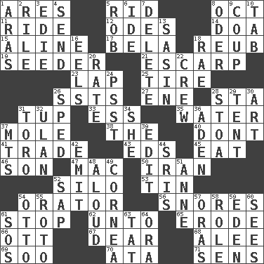 ACROSS 1. Ancient Greek god of war 5. To free from 8. Sep. follower 11. Travel on an animal 12. Lyric poems 14. ___ good deed 15. Place in a line 17. Actor Lugosi 18. Reuben's nickname 19. Sowing specialist 21. Fortification 23. Pet locale 25. Hoop that covers a wheel 26. Fast planes 27. Compass dir. 28. R.R. building 31. Uncastrated adult male sheep 33. Double-curved letter 35. Wetness 37. Undercover agent 38. Definite Article 40. Do not 41. Barter 43. Begley and Asner 45. Consume 46. Boy, to dad 47. Big _ 50. SW Asia republic 52. Grain storage tower 53. Shallow baking pan 54. Speaker 56. Sounds asleep 61. Constrict 62. To (old English) 65. Eat (away) 66. Baseball player Mel 67. Letter starter 68. Toward shelter 69. "Barney Miller" actor Jack 70. "One Day ___ Time" 71. Elected reps. DOWN 1. Ancient river in northeast Turkey 2. Cause heat under the collar 3. Singer Brickell 4. Post 5. Director Reiner 6. Binary compound 7. Keyboard key 8. River in Europe 9. Clever action or accomplishment 10. Keyboard key 13. Indian antelope 16. Snakelike fish 18. Actress Charlotte 20. Pace 22. Ship's personnel 24. Inconspicuous attention getter 26. Hurried 28. Portico 29. Portable shelter 30. Tate display 31. "Corrida" creature 32. Uhlan (variant) 34. A female animal or person 36. An important port of Yemen 37. Mountains (abbr.) 39. Prepare for publication 42. Send forth 44. Indian titles of respect 48. Verbally 49. Pupil covering 51. Queen of England 1702-14 52. Plant excrement 54. "Beetle Bailey" pooch 55. Printing process, for short 57. Mouths or openings 58. Hero or heavy, e.g. 59. Paradise 60. Observes 61. Distress signal 63. Make lace 64. Mouth or opening