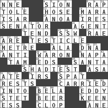 ACROSS 1. Compass dir. 4. The Jewish people; Israel 8. Strike 11. Lacquered or enameled metalware 13. Flexible conduit 14. Hindu Mythology: god of death 15. Austrian river, tributary to the Danube 16. Small Philippine buffalo 17. Angers 18. Elected representative 21. Representative 22. Look after 23. Compass dir. 25. Actress Charlotte 26. "We ___ not amused" (Victoria) 29. One of the two male reproductive glands 32. Distance measurement (Brit.) 34. Insect wing 35. Heredity factor (abbr.) 38. Opposed to 39. Make _____ (do battle with) 41. California wine valley 43. Scottish cap 44. Begley and Asner 45. Before Barbara or Clara 46. Most questionable 50. White ___ sheet 51. Had dinner 54. Big collection agency 55. Argument over a trivial matter 57. Musical pauses 59. Borne 63. To the inside or interior of 64. Actor Lugosi 67. Whirlpool 68. Proofreading order 69. Fermented drink made from hops 70. Peachy ____! 71. Double-curved letter 72. Hoof sound 73. One (Scot) DOWN 1. Nuclear Threat Initiatives 2. Characteristic smell of wine 3. Flair 4. Broken pieces 5. Electrically charged atom 6. Bear (Spanish) 7. Teachers' org. 8. Less widely known 9. Sports stadium 10. Thick mixture 12. Part of Q.E.F. 14. Russian fighter aircraft 19. False hair 20. Single 21. Leather borer 23. Grain storage tower 24. Examine hastily 26. Housemaid (var.) 27. Monthly bill 28. Singer James 30. Tarsus (plural) 31. Pulitzer Prize-winning author Ferber 33. Basketball hoops 36. Grandmother 37. Tenement units (abbr.) 39. Put on (as clothing) 40. Does sums 42. American Automobile Association (abbr.) 45. Play the lead 47. Part of HMS, perhaps 48. Fortification 49. Health resort 51. Originate 52. Portable shelters 53. _____ Park, CO 56. Long journey 58. Small child 60. It may be bright or harebrained 61. Locale of original sin 62. Centimeter-gram-second unit of force 64. English channel? 65. Snakelike fish 66. Lion