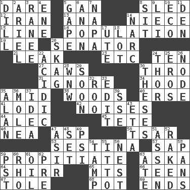 ACROSS 1. Have the gumption 5. Separate the seeds from cotton 8. Downhill vehicle 12. SW Asia republic 13. Santa ___, CA 14. Sibling's daughter 15. Actor's bit 16. Census information 19. Area sheltered from the wind 20. Legislator 21. Path through which fluid escapes 23. And so on (abbr.) 24. "___ Little Indians" 27. Crow sounds 30. Through, poetically 31. Refuse to acknowledge 34. Parka part 35. Among 38. Forest 40. Celtic language 41. Farming town in central California 42. Annoying sounds 44. Actor Baldwin 45. Wig 46. Teachers' org. 47. Viper 50. Russian ruler of old 53. French poetic form 57. Plant excrement 59. Conciliate 63. "____ silly question..." 64. Bake eggs in their shells 65. Mountains (abbr.) 66. Adolescent 67. Lacquered or enameled metalware 68. Plant holder 69. Extremities DOWN 1. Deli pickle 2. Satellite of Uranus 3. Indian princess (variant) 4. Compass dir. 5. Stare wonderingly 6. Soon (poet.) 7. California wine valley 8. Be seated 9. Luau accessory 10. Environmental prefix 11. Lair 14. Drug cop 17. Shoshoni 18. Car dealer's back yard 20. Heroin 22. Being or containing an acid 24. Son of Odin 25. Greek god of love 26. Connecting point 28. Compass dir. 29. Within a short period 30. College papers 32. Friend of Pooh 33. Prepare for publication 35. Actor Alda or Thicke 36. Undercover agent 37. The content of cognition 39. Compass dir. 43. Singer James 47. SW Saudi Arabia district 48. Put into a specified state 49. Air pressure measure (abbr.) 51. NE Netherlands city 52. Swept the length of 54. Pack (down) 55. "Tell ____ the Marines!" 56. Egg locale 58. Baking dishes 59. Pacific Standard Time (abbr.) 60. 17th letter of the Greek alphabet 61. Petroleum 62. Before (prefix) 63. Had dinner