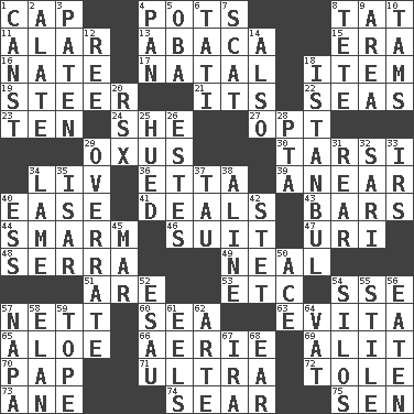 ACROSS 1. Head covering 4. Plant holders 8. Make lace 11. Having or resembling wings 13. Phillipine bananalike plant 15. Epoch 16. Nathan's nickname 17. Relating to or accompanying birth 18. A whole individual unit 19. Guide 21. ___ a Wonderful Life 22. Oceans 23. Nine, plus one 24. A female animal or person 27. Elect 29. The longest river in Central Asia 30. Tarsus (plural) 34. 54 in ancient Rome 36. Singer James 39. Approach 40. Comfort 41. Allots cards 43. Taverns 44. Excessive but superficial compliments 46. Set or collection 47. RI univ. 48. Spanish missionary in California 49. Anneal 51. "We ___ not amused" (Victoria) 53. And so on (abbr.) 54. Compass dir. 57. Remaining after all deductions 60. Ocean 63. Webber/Rice musical 65. Medicinal plant 66. Nest on high 69. Set down 70. Infant food 71. Extreme 72. Lacquered or enameled metalware 73. A saturated hydrocarbon 74. Scorch 75. Elected rep. DOWN 1. 2nd pers. sing. pres. of can (arch.) 2. Having winglike extensions 3. Eucharist need 4. Baking dish 5. Chief or king in Benin or Nigeria 6. Jacques of French films 7. Scram! 8. False hair 9. Length times width 10. Scottish caps 12. To separate or throw off 14. In addition 18. Byzantium, centuries later 20. Acura sports coupe 25. Became colored 26. _____ Park, CO 28. Parent Teacher Assoc. 29. Make much ado about nothing 31. Stern 32. Indian skirt 33. Big collection agency 34. Unable to walk 35. Austrian river, tributary to the Danube 37. The 19th letter of the Greek alphabet 38. Place in a line 40. Double-curved letter 42. Proofreading order 45. Spoil 50. Adept person 52. Son of Isaac 54. Grain storage towers 55. Vertical member of a panel or frame 56. Consumed 57. California wine valley 58. Enthusiasm 59. Drink excessively 61. Snakelike fish 62. Johnson of "Laugh-In" 64. Large container 67. Retirement account (abbr.) 68. Ewer handle