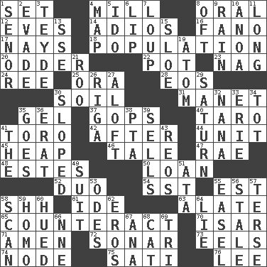 ACROSS 1. Put into a specified state 4. Place where flour is made 8. Spoken 12. Nights before holidays 14. Goodbye (Sp.) 16. Papal veil 17. Negative votes 18. Census information 20. More peculiar 22. Cooking vessel 23. Tired old horse 24. Portuguese money of account (variant) 25. Mouth or opening 28. Greek goddess of the dawn 30. Earth 31. French painter Edouard 35. Set 37. Republicans 40. Edible starchy tuberous root 41. "Corrida" creature 42. Following 44. A single undivided whole 45. Pile 46. Falsehood 47. Actress Charlotte 48. _____ Park, CO 50. Grant temporary use of 52. Superhero pair 54. Fast jet (abbr.) 55. Eastern Standard Time (abbr.) 58. Quiet! 61. Binary compound 63. Having winglike extensions 65. Act in opposition 70. Austrian river, tributary to the Danube 71. So be it 72. Underwater navigation system 73. Snakelike fish 74. Connecting point 75. Suttee (variant) 76. Area sheltered from the wind DOWN 1. Sir (Sp.) 2. Elude 3. Miss Universe 1986, Barbara Palacios _ 4. Atlas unit 5. Wedding promise 6. Mouth edge 7. Central Nebraska county 8. Often (poetically) 9. Precipitation 10. Small Philippine buffalo 11. Having great length 13. Compass dir. 15. _ gin 19. Tiny particle 21. Friend of Pooh 26. Port city in Latvia 27. At or to great height 29. Titan orbits this 30. Inclined 32. Nanny 33. 4th largest of the Great Lakes 34. Small child 35. Moves 36. Part of Q.E.F. 38. Parent Teacher Association (abbr.) 39. Makes a sale 41. Definite Article 43. Vintage cars 49. Set of matching outer garments 51. _ moment's notice (2 wds.) 53. Lyric poems 55. Artist's stand 56. Lacking originality or spontaneity 57. Laconic 58. Skim 59. Like (prefix) 60. Took on color 62. Greek god of love 64. Falsehood 66. Compass dir. 67. Santa ___, CA 68. Domesticated feline 69. Three (prefix)
