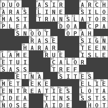 ACROSS 1. Superhero pair 4. SW Saudi Arabia district 8. Bowlike part 12. Caspian sea tributary 14. Actor's bit 15. Grain storage tower 16. Vertical spar for supporting sails 17. Interpreter 20. Entreaty 21. ___ good deed 22. Accounting whiz (abbr.) 23. Snout, nose 27. Brightly colored fish 29. To erase 31. Attach a signature 34. Ethiopian city, capital of Harari 35. Adolescent 36. Unable to walk 39. Regret 41. Small island 42. Needle case 43. Bodily heat indicating an inflammation 46. Backtalk 47. Not kosher 48. Inactive volcano in Sicily 51. Locates 54. Was introduced to 56. Supplement with great effort 58. Writer Wiesel 61. Pleas 66. Globular water bottle used in Asia 67. The content of cognition 68. Canisters 69. Fast planes 70. Sense of smell 71. Helper 72. Being at a high temperature DOWN 1. Moist 2. Mountain range 3. Fertile tracts in a desert 4. The first octave above the treble staff 5. Title for a knight 6. _ tizzy (2 wds.) 7. Tear apart 8. White ___ sheet 9. Actors Guy, Robert Welles, and Clint 10. Hoof sound 11. Israeli folk dance 13. Comedian Laurel of Laurel & Hardy 18. "Barney Miller" actor Jack 19. Pet locale 24. Mouth or opening 25. Boat paddle 26. Russian ruler of old 28. Having gotten out of bed 30. Spew [out] 32. Set 33. Compass dir. 34. Robbery 36. French article 37. "One Day ___ Time" 38. French bagpipes 40. Hearing organs 44. Luau accessory 45. Often (poetically) 49. Born 50. Alias (abbr.) 52. Snakelike fish 53. Agitate, as a liquid 54. Count _ (2 wds.) 55. Inside; within (prefix) 57. Singer James 59. "Tell ____ the Marines!" 60. 90 degrees 62. Actress Charlotte 63. One more than two 64. Conclude 65. Compass dir.