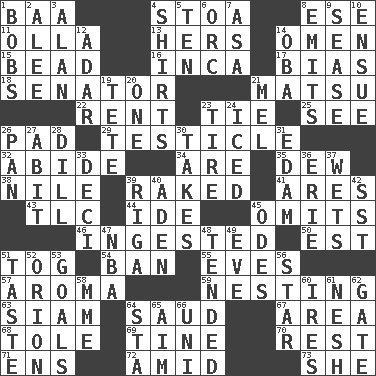 ACROSS 1. Sound made by sheep 4. Portico 8. Compass dir. 11. Rounded earthenware pot or jar 13. Possessive pronoun 14. Presage 15. Necklace unit 16. South American Indian 17. Prejudice 18. Legislator 21. Taiwanese island in East China Sea 22. Monthly bill 23. Neckwear 25. Perceive with the eye 26. Groovy apt. 29. One of the two male reproductive glands 32. Stay 34. "We ___ not amused" (Victoria) 35. Morning condensation 38. Mediterranean tributary 39. Swept the length of 41. Ancient Greek god of war 43. Affectionate concern, for short 44. Binary compound 45. Leaves out 46. Consumed 50. Eastern Standard Time (abbr.) 51. Coat; cloak 54. Forbid 55. Nights before holidays 57. Odor 59. Inhabiting a nest 63. Thailand, formerly 64. Saudi Arabian king (1953-1964) 67. Type of rug 68. Lacquered or enameled metalware 69. Prong on a fork 70. Relief 71. Followers of ems 72. Among 73. A female animal or person DOWN 1. Moves up and down 2. Toward shelter 3. ____ Jay Lerner 4. Upper-body garments 5. Nine, plus one 6. The grampus (Milton) 7. White ___ sheet 8. Sends forth 9. Gospel singer Marvin 10. Take place subsequently 12. The sixth month of the Jewish calendar 14. Chief or king in Benin or Nigeria 19. False hair 20. Single 21. Cartoonist voice _ Blanc 23. Become fatigued 24. On the rocks 26. Baking dish 27. "This won't hurt ____!" 28. Deli pickle 30. Receives possession of 31. Dutch treat 33. Tenth: prefix 36. One of the Great Lakes 37. Moistens 39. Capital of Latvia 40. An important port of Yemen 42. Fast jet (abbr.) 45. Lyric poems 47. Basketball assoc. 48. Watched over 49. First lady 51. Clothes sense 52. Greek mythologigal hunter 53. Scores awarded for successful feats 56. Play the lead 58. Madame (abbr.) 60. Angers 61. Soft 62. Yard entry 64. R.R. building 65. Direct toward a target or goal 66. University (slang)