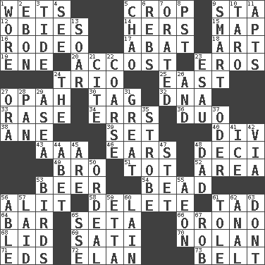 ACROSS 1. Moistens 5. Riding implement 9. R.R. building 12. Off-Broadway awards 14. Possessive pronoun 15. Atlas unit 16. Cowboy competition 17. Blind as ____ 18. Tate display 19. Compass dir. 20. Buttonhole 23. Greek god of love 24. Musical group of three 25. Compass direction 27. Brightly colored fish 30. Label 32. Heredity factor (abbr.) 33. Raze (variant) 34. Blunders 36. Superhero pair 38. One (Scot) 39. Arrange properly for use 40. HTML Container Element 43. Auto club (abbr.) 46. Hearing organs 48. Tenth: prefix 49. Sis' sibling 51. Small child 52. Length times width 53. Fermented drink made from hops 54. Necklace unit 56. Set down 58. Keyboard key 61. Small amount or degree 64. Long, evenly shaped piece 65. Bristle 66. U. of Maine site 68. Flaplike covering 69. Suttee (variant) 70. Pitcher Ryan 71. Begley and Asner 72. Liveliness 73. Waist strap DOWN 1. Had on 2. Inky black, to poets 3. Event that recurs at intervals 4. Observe 5. US Secretary of Labor Elaine L. _ 6. Confederate soldiers (slang) 7. Spoke pompously 8. Pacific Standard Time (abbr.) 9. Don Adams' spy role 10. Edible starchy tuberous root 11. Tenement units (abbr.) 13. Fly high 21. Quote 22. Unrefined 23. Son of Isaac 24. Definite Article 26. Added to 27. Mouth or opening 28. Baking dish 29. At sea 31. Relatively large 35. Disco prop 37. Baltic tributary 41. Frozen water 42. By way of 44. Collude with 45. "We ___ not amused" (Victoria) 47. Proofreading order 48. Male parent 50. Severe or trying experience 53. Avian creatures 55. Period of immesurable duration 56. Competent 57. Put down 59. Singer James 60. (Had) reclined 61. Lacquered or enameled metalware 62. Of or related to the anus 63. Do not 65. Compass dir. 67. Director Reiner