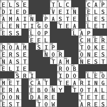 ACROSS 1. Otherwise 5. Affectionate concern, for short 8. Head covering 11. Passed on 12. Distinctive style or manner 14. Raised railways 15. With great haste 17. Thick mixture 18. French article 19. Small, flat, pigmented spot on the skin 21. Beverage made from leaves 22. Allow 23. Double-curved letter 24. Trim (branches) 25. Infant locale 27. Snakelike fish 28. "Mermaids" star 31. Wander 35. Small drink 37. Casino tip 38. Celtic language 39. And not 41. Singles 42. Political cartoonist Thomas 43. Scottish cap 45. Egg locale 46. Writer Wiesel 47. Director Reiner 49. Indian title of respect (Mr.) 51. Wedding promise 52. Lion 55. Was introduced to 57. Domesticated feline 60. Rending 62. Epoch 63. Dark wood 65. "_____ Recall" 66. Spanish title 67. Have the gumption 68. False hair 69. Eastern Standard Time (abbr.) 70. Pull behind 71. Ancient Greek god of war DOWN 1. Peak District village in England 2. Citrus fruits 3. Seines 4. Prepare for publication 5. Federal power corp. 6. For fear that 7. Quote 8. Portable communications device 9. Toward shelter 10. Inconspicuous attention getter 13. Anneal 16. Mediterranean tributary 17. Cotton for raincoats, e.g. 20. Leaves 26. NE Massachussets city 29. Makes supply last 30. Respite 31. French philosopher Descartes 32. Taken by mouth 33. Aide 34. Distance measurement 36. Cooking vessel 40. Noteworthy scarcity 44. Method 48. Water vessel 50. On the rocks 52. 61 cubic inches 53. Related on the mother's side 54. Stares 55. Ancient Persian 56. Greek god of love 58. Blind as ____ 59. "Corrida" creature 61. Roll call or roster of names 64. ___ Haven, CT