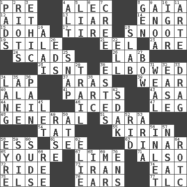 ACROSS 1. Before (prefix) 4. Actor Baldwin 8. Greek goddess of the earth (variant) 12. Small island 13. One who doesn't tell the truth 14. Engineer (abbr.) 15. Capital of the state of Qatar 17. Hoop that covers a wheel 18. Snout, nose 19. Vertical member of a panel or frame 21. Snakelike fish 23. "We ___ not amused" (Victoria) 24. Heaps 26. Experiment locale 28. Is not 30. Turned at an angle; bent 34. Infant locale 37. Caspian sea tributary 39. Erode 40. Wing 41. Pieces 43. White ___ sheet 44. Famous astronaut Armstrong 46. On the rocks 47. Part of a journey 48. Commissioned military rank 51. "Two Mules for Sister ____" 54. Make lace 55. Japanese brewing company 58. Curvy letter 61. Perceive with the eye 63. Middle Eastern gold or silver currency 65. You are 67. Welles in "The Third Man" 71. In addition 72. Travel on an animal 73. SW Asia republic 74. Erode 75. Otherwise 76. Hearing organs 77. Affectionate concern, for short DOWN 1. Groovy apts. 2. Debaucheries 3. Value system 4. The first octave above the treble staff 5. Cards in a Roman deck? 6. Ewer handle 7. Algonquian 8. Commissioned military rank (abbr.) 9. Small Philippine buffalo 10. Composer Stravinsky 11. Johnson of "Laugh-In" 16. Jai _ 18. Broad, flat, thick piece 20. Begley and Asner 22. Pipe bend 25. Fastener 27. Arrow shooter 29. Hang back 30. _____ Park, CO 31. Welt 32. Relaxation 33. To trail on the ground 34. Austrian-born American filmmaker Fritz 35. Toward shelter 36. Ache 38. Curve 42. Neighbor of Neb. 45. Allow 49. To erase 50. Had dinner 52. To free from 53. Roberta Peters solo 56. An arm off of a larger body of water 57. Relating to the nose 58. Jane of fiction 59. Land 60. Soap bubbles 62. Writer Wiesel 64. College mil. group 66. Portuguese money of account (variant) 68. Lyricist Gershwin 69. Make imperfect 70. Followers of ems