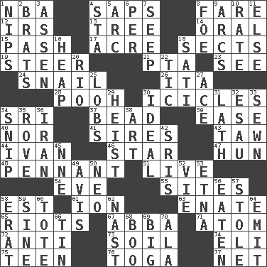ACROSS 1. Basketball assoc. 4. Plant excrements 8. Conductor's collection 12. Big collection agency 13. Woody plant 14. Of the mouth 15. Romantic infatuation 17. Land measure 18. Religious groups 19. Guide 21. Parent Teacher Association (abbr.) 23. Perceive with the eye 24. Slow-paced one 26. Call ___ day 28. "Silly old bear" 30. Winter's stalactites 34. _ Lanka 37. Necklace unit 39. Comfort 40. And not 41. Begets 43. The 23rd letter of the Hebrew alphabet 44. _ the terrible 46. Play the lead 47. Attila the _ 48. Pre-World Series prize 51. Not recorded 54. First lady 55. Settings 58. Eastern Standard Time (abbr.) 61. Electrically charged atom 63. Maternal 65. Disturbances 67. Swedish rock group 71. Smallest unit of an element 72. Opposed to 73. Land 74. Connecticut Ivy Leaguer 75. Adolescent 76. Ancient Roman robe 77. Fish or hair follower DOWN 1. Pinches, bites 2. Naughty children 3. NE Netherlands city 4. R.R. building 5. Curve 6. For each 7. Ooze 8. Enemy 9. Arches 10. Assign a rank or rating to 11. Otherwise 16. Pile 18. Suttee (variant) 20. _ de Janeiro 22. Nervous spasm 25. Tennis shots 27. Adept person 29. Robbery 30. Standard of perfection 31. Thin strip of wood or metal 32. Son of Isaac 33. Stitched 34. Clip 35. Be footloose 36. SW Asia republic 38. Tate display 42. Indian titles of respect 45. Compass dir. 49. Opinion 50. Modern: prefix 52. Compete 53. Inactive volcano in Sicily 56. Eroded 57. Took without asking 58. Part of Q.E.F. 59. Trig term 60. Carry 62. Political cartoonist Thomas 64. Send forth 66. Metal container 68. Oct. 31 cry 69. Massive 70. In the manner of
