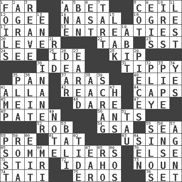 ACROSS 1. At a great distance 4. Collude with 8. To provide with a ceiling 12. Double curve, resembling the letter S 14. Rhinal 16. Legendary monster 17. SW Asia republic 18. Pleas 20. Crowbar 22. Bar bill 23. Fast jet (abbr.) 24. Observe 25. Binary compound 28. Sleep 30. The content of cognition 31. Likely to tip or tilt 35. Baking dish 37. Caspian sea tributary 40. Writer Wiesel 41. Silent film actress Nazimova 42. Arrive at 44. Balmoral and tarboosh 45. Count _ (2 wds.) 46. Have the gumption 47. Sight organ 48. Eucharist need 50. Pismires 52. Director Reiner 54. Girls' org. (abbr.) 55. Ocean 58. Before (prefix) 61. Make lace 63. Putting into practice 65. Wine waiters 70. Otherwise 71. Disorderly outburst 72. Potato state 73. Part of speech 74. Jacques of French films 75. Greek god of love 76. Put into a specified state DOWN 1. Fencing necessities 2. Match 3. Rob, plunder, or pillage 4. A saturated hydrocarbon 5. Bar 6. Eastern Standard Time (abbr.) 7. Small pie 8. Small bed 9. The front part of a cuirass 10. Angers 11. For fear that 13. Compass dir. 15. Path through which fluid escapes 19. "This won't hurt ____!" 21. To free from 26. Letter starter 27. Having ears or earlike features 29. Parts 30. More lacking in sense or substance 32. Romp 33. Corncob 34. Consenting reply 35. Entreaty 36. Came down and settled, as after flight 38. American Automobile Association (abbr.) 39. Strangle with an iron collar 41. Electrical Unit 43. Coop moms 49. Make mention of 51. The 19th letter of the Greek alphabet 53. Indonesian resort city 55. Grain storage towers 56. Follow as a consequence or result 57. Rep 58. Inconspicuous attention getter 59. Round or rotation of duties 60. Give off 62. Event that recurs at intervals 64. Elected rep. 66. Medical imaging device (abbr.) 67. Hearing organ 68. 17th letter of the Greek alphabet 69. Distress signal
