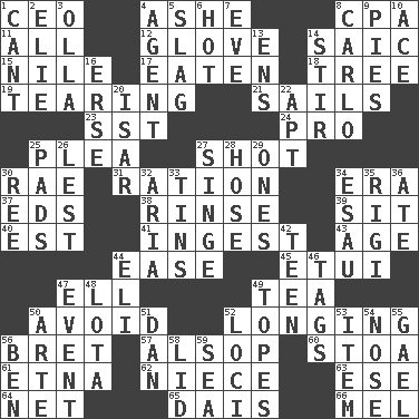 ACROSS 1. Corporate head (abbr.) 4. American tennis player Robert 8. Accounting whiz (abbr.) 11. 100% 12. Michael Jackson trademark 14. Ketch in the Levant 15. Mediterranean tributary 17. Consumed 18. Relationship diagram 19. Lacerating 21. Travel by water 23. Fast jet (abbr.) 24. Adept person 25. Entreaty 27. Attempt 30. Actress Charlotte 31. Food allowance for one day 34. Period 37. Begley and Asner 38. Wash lightly 39. Be seated 40. Eastern Standard Time (abbr.) 41. Swallow 43. Grow older 44. Comfort 45. Needle case 47. Pipe bend 49. Beverage made from leaves 50. Prevent the occurrence of 52. Yearning 56. Cy Young winner Saberhagen 57. Columnist Joseph or Stewart 60. Portico 61. Inactive volcano in Sicily 62. Sibling's daughter 63. Compass dir. 64. Fish or hair follower 65. Raised platform 66. Cartoonist voice _ Blanc DOWN 1. Patter 2. Writer Wiesel 3. Water jar 4. Representative 5. Volcanic refuse 6. Being at a high temperature 7. First lady 8. Monte _, Las Vegas Hotel/Casino 9. Sliced desserts 10. Adept person 13. Followers of ems 14. Commotion 16. Celtic language 20. Austrian river, tributary to the Danube 22. Fitting 25. Groovy apts. 26. For fear that 27. Scorch 28. Flexible conduit 29. Washington bills 30. To separate or throw off 32. Roberta Peters solo 33. Canisters 34. He sold his birthright 35. Swiss mountan, "Queen of the Mountains" 36. Had dinner 42. Adolescent 44. Connecticut Ivy Leaguer 46. Labels 47. Incident 48. Globular water bottle used in Asia 49. Drinks excessively 50. Johnson of "Laugh-In" 51. Daniel's nick name 52. Event scenes 53. A whole individual unit 54. Sense of smell 55. Highlander 56. Benjamin's nick name 58. Flaplike covering 59. Ocean
