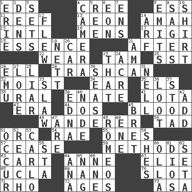 ACROSS 1. Begley and Asner 4. Algonquian 8. Curvy letter 11. Coral collection 13. Period of immesurable duration 14. Housemaid 15. International (abbr.) 16. Not women's 17. Swiss mountan, "Queen of the Mountains" 18. Gist 21. Following 22. Erode 23. Scottish cap 25. Fast jet (abbr.) 26. Pipe bend 29. File 13 32. Damp 34. Hearing organ 35. Raised railways 38. Mountain range 39. Related on the mother's side 41. Globular water bottle used in Asia 43. Epoch 44. Two (Sp.) 45. Vital fluid 46. Roamer 50. Bit 51. The grampus (Milton) 54. Actress Charlotte 55. Washington bills 57. Desist 59. Modes 63. Haul 64. Singer Murray 67. Writer Wiesel 68. Southern CA. univ. 69. Billionth: prefix 70. Narrow, elongated depression 71. 17th letter of the Greek alphabet 72. Matures 73. White ___ sheet DOWN 1. One of the Great Lakes 2. Hiding places for outlaws 3. Puts into a specified state 4. Device for capturing images 5. To sift 6. Period of immesurable duration 7. Followers of ems 8. Gives off 9. Gurus 10. Upper-body garment 12. Soared 14. Sandy's bark 19. Remaining after all deductions 20. Automobile 21. Wet nurse (var.) 23. Not this but _ 24. 43,560 square feet 26. Australian flightless bird 27. Old wives' tales, e.g. 28. One who doesn't tell the truth 30. Gospel singer Marvin 31. 1994 drama film starring Jodie Foster 33. Cole _ (cabbage dish) 36. Plunder 37. Portico 39. Pulitzer Prize-winning author Ferber 40. Thickened enlargement 42. Find the sum of 45. Cy Young winner Saberhagen 47. "We ___ not amused" (Victoria) 48. Lover boys 49. Compass dir. 51. Happen 52. Arrive at 53. Monte _, Las Vegas Hotel/Casino 56. "______ My Girl" (Turtles hit) 58. R.R. building 60. Spanish pot 61. "Vaya con ____" 62. Bristle 64. Santa ___, CA 65. Tired old horse 66. Compass dir.