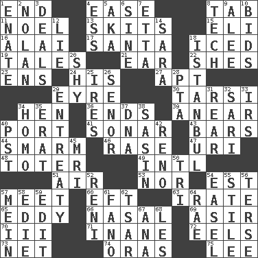 ACROSS 1. Conclude 4. Comfort 8. Bar bill 11. Christmas carol 13. Burlesque acts 15. Biblical high priest 16. Jai _ 17. Before Barbara or Clara 18. On the rocks 19. Lies 21. Hearing organ 22. "______ My Girl" (Turtles hit) 23. Followers of ems 24. Part of HMS, perhaps 27. Fitting 29. Jane of fiction 30. Tarsus (plural) 34. Layer 36. Extremities 39. Approach 40. Sweet dark-red dessert wine 41. Underwater navigation system 43. Drinking establishments 44. Excessive but superficial compliments 46. To erase 47. RI univ. 48. Carrier 49. International (abbr.) 51. Wind 53. Or not 54. Eastern Standard Time (abbr.) 57. Rendezvous 60. Bank Draft (abbr.) 63. Feeling or showing extreme anger 65. Whirlpool 66. Relating to the nose 69. SW Saudi Arabia district 70. One more than two 71. Lacking in sense or substance 72. Snakelike fish 73. Fish or hair follower 74. Mouths or openings 75. Area sheltered from the wind DOWN 1. Maternal 2. Pitcher Ryan 3. Allots cards 4. Double-curved letter 5. Alias (abbr.) 6. Trig term 7. Singer James 8. Technician 9. Toward shelter 10. Auction offers 12. Untruth 14. "Two Mules for Sister ____" 18. Byzantium, centuries later 20. Like a shrinking violet 25. Angers 26. Sir (Sp.) 28. Parent Teacher Assoc. 29. Plea 31. Rump 32. Indian skirt 33. Big collection agency 34. Same (prefix) 35. Part of Q.E.F. 37. Heredity factor (abbr.) 38. Indian antelope 40. Pacific Standard Time (abbr.) 42. Western Nevada city 45. Medical imaging device (abbr.) 50. Three (prefix) 52. Painter Guido (1575-1642) 54. Artist's stand 55. Vertical member of a panel or frame 56. Laconic 57. Count _ (2 wds.) 58. Singer Brickell 59. Prepare for publication 61. Papal veil 62. Russian ruler of old 64. Actress Charlotte 67. Santa ___, CA 68. French article