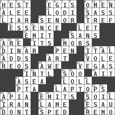 ACROSS 1. Behest 5. The front part of a cuirass 9. Sign of something about to happen 13. Toward shelter 14. Farming town in central California 15. Backtalk 16. One who doesn't tell the truth 17. Sir (Sp.) 18. Not kosher 19. Substance 21. Allow 22. Send forth 23. Without 24. "We ___ not amused" (Victoria) 27. It is 28. Disorderly crowds 29. Middle Eastern gold or silver currency 31. Fenced enclosure 32. Slanted text style (abbr.) 36. Does sums 37. Tate display 38. Grand slam 39. Vintage cars 40. Deep reverence 41. Viva Las _ 42. International (abbr.) 44. "Barney Miller" actor Jack 46. Small island 47. At sea 48. Hang loosely or laxly 50. Parent Teacher Assoc. 51. Portable computers 54. Capital of Western Samoa 56. Sends forth 58. The visible part of the earth's surface 60. SW Asia republic 61. Unable to walk 62. He sold his birthright 63. Do not 64. Broke a traffic law 65. San ____ (Riviera town) DOWN 1. Actor Linden 2. Writer Wiesel 3. Oceans 4. Laconic 5. Chooses 6. Went 7. Wedding promise 8. Title for a knight 9. Clearly or manifestly demonstrative 10. Shops 11. Compass dir. 12. Science/research agcy. 17. In a ____ (agitated or irritated) 20. Independent ruler or chieftain 21. Experiment locale 23. Male child 24. The sixth month of the Jewish calendar 25. Travel on an animal 26. Inside; within (prefix) 28. Was introduced to 30. Aide 31. Before (prefix) 33. Ancient Roman robe 34. Mountain range southwest of Kyrgyzstan 35. For fear that 37. Leather borer 40. _ moment's notice (2 wds.) 41. Electrical Unit 43. Teachers' org. 44. Scheduled 45. I made a mistake 47. Bee-related 49. Failure 51. Welles in "The Third Man" 52. Introduce or present, as a question 53. Thailand, formerly 54. Assist 55. Adept person 56. Raised railways 57. Atlas unit 59. Nilotic language