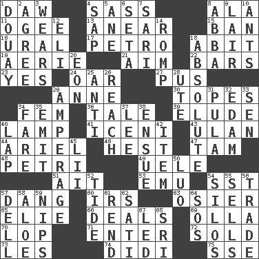 ACROSS 1. Fool 4. Backtalk 8. According to 11. Double curve, resembling the letter S 13. Approach 15. Forbid 16. Mountain range 17. Stone: prefix 18. "This won't hurt ____!" 19. Nest on high 21. Direct toward a target or goal 22. Drinking establishments 23. Consenting reply 24. Boat paddle 27. Ichor 29. Singer Murray 30. Drinks excessively 34. Opposite of masc. 36. Lie 39. Evade 40. Desk light 41. Ancient Celtic tribe of eastern Britain 43. ____ Bator, Mongolia 44. Satellite of Uranus 46. Behest 47. Scottish cap 48. _ dish (used to culture cells) 49. Ubangi River tributary 51. Small island 53. Australian flightless bird 54. Fast jet (abbr.) 57. Mild oath, euphamism for damn 60. Big collection agency 63. Flexible twig of a willow tree 65. Writer Wiesel 66. Allots cards 69. Water jar 70. Trim (branches) 71. Keyboard key 72. Exchanged or delivered for money 73. French article 74. "You Light Up My Life" star Conn 75. Compass dir. DOWN 1. A city in N France, SE of Calais 2. Match 3. Erodes 4. Plant excrement 5. A saturated hydrocarbon 6. Stalk of a moss capsule 7. Indian skirt 8. Swedish rock group 9. Den 10. Pismires 12. Connecticut Ivy Leaguer 14. Frolic 18. Utter; complete 20. A really long time 25. Against 26. Arrive at 28. Shoshoni 29. Electrical Measurement 31. Monetary unit of Botswana 32. Dutch treat 33. Elected rep. 34. Conductor's collection 35. Send forth 37. Area sheltered from the wind 38. Follow as a consequence or result 40. Infant locale 42. A distinct part 45. Cards in a Roman deck? 50. Nilotic language 52. Periodic rise and fall of the sea level 54. Grain storage towers 55. Makes a sale 56. Exchange 57. Small valley 58. _ vera 59. Cuts off 61. Tear apart 62. Suttee (variant) 64. Distress signal 67. Directed 68. _ Lanka