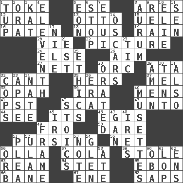 ACROSS 1. Puff or smoke 5. Compass dir. 8. Ancient Greek god of war 12. Mountain range 13. Von Bismarck 15. Ubangi River tributary 16. Eucharist need 18. Common sense 19. Water falling in drops from the sky 20. Compete 22. Photo 24. Otherwise 26. Direct toward a target or goal 27. Remaining after all deductions 28. The grampus (Milton) 29. "One Day ___ Time" 32. Patter 35. Possessive pronoun 37. Cartoonist voice _ Blanc 38. Brightly colored fish 39. Retirement account (abbr.) 40. Not women's 41. Pacific Standard Time (abbr.) 42. Leave at once 43. To (old English) 44. Perceive with the eye 45. It is 46. Armor plate that protects the chest 49. Back 50. Have the gumption 51. Puckering 55. Fish or hair follower 56. Water jar 57. Root beer relative 59. Fur scarf 63. 480, 500 or 516 sheets of paper 64. Proofreading order 65. Inky black, to poets 66. Object of repulsion 67. Compass dir. 68. Plant excrements DOWN 1. Uncastrated adult male sheep 2. Mouth or opening 3. Krazy ___ of comics 4. Veterans Day date 5. Age 6. Halt 7. Needle holder 8. Gold (Symbol: Au) 9. Bring up, as a child 10. Writer Wiesel 11. Elected rep. 14. Motion picture awards 17. The longest river in the world 21. Eastern Standard Time (abbr.) 23. Nervous spasm 25. Value system 28. Declaimed 29. So be it 30. Portable shelter 31. In addition 32. 911 reaches them 33. Domed church section 34. Nathan's nickname 36. Epoch 40. French bagpipes 42. Unemotional ones 45. Big collection agency 47. Separate the seeds from cotton 48. Angers 49. Movie unit 51. Entreaty 52. ____ Bator, Mongolia 53. Observe 54. Small, secluded valley 56. Globe 58. Had dinner 60. Chief or king in Benin or Nigeria 61. Trim (branches) 62. Followers of ems