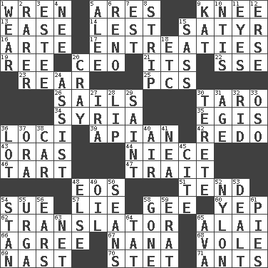 ACROSS 1. Songbird 5. Ancient Greek god of war 9. Leg joint 13. Comfort 14. For fear that 15. Man with strong sexual desires 16. Johnson of "Laugh-In" 17. Pleas 19. To sift 20. Corporate head (abbr.) 21. ___ a Wonderful Life 22. Compass dir. 23. Posterior 25. Personal Computers (abbr.) 26. Travel by water 30. Pacific island yam 34. Damascus' land 35. Armor plate that protects the chest 36. Venues 39. Bee-related 42. Make new 43. Mouths or openings 44. Sibling's daughter 46. Small pie 47. Distinguishing feature 48. Greek goddess of the dawn 51. Look after 54. Institute legal proceedings 57. Untruth 58. Turn to the right 60. Slangy assent 62. Interpreter 65. Jai _ 66. Match 67. Grandmother 68. Grand slam 69. Political cartoonist Thomas 70. Proofreading order 71. Pismires DOWN 1. Erode 2. Less widely known 3. First name in cosmetics 4. Born 5. Toward shelter 6. Western Nevada city 7. Eastern Standard Time (abbr.) 8. Long narrow piece of something 9. Krazy ___ of comics 10. Nuclear Threat Initiatives 11. Sight organs 12. Celtic language 15. Backtalk 18. And so on (abbr.) 20. Supercomputer manufacturer 24. Aid 27. Retirement account (abbr.) 28. Mouth edge 29. Virtuous person 30. Cigar-shaped 31. Personal question 32. To free from 33. Bear (Spanish) 36. Car dealer's back yard 37. Mouth or opening 38. 4-wheeled motor vehicle 40. Wind 41. Teachers' org. 45. Quote 48. Otherwise 49. Petroleum 50. Seines 52. High-strength synthetic material 53. Started a card game 54. Comedian Laurel of Laurel & Hardy 55. Capital and largest city of Mongolia 56. Hearing organs 58. Went 59. Part of Q.E.F. 61. Sliced desserts 63. Fish or hair follower 64. Make lace 65. Actress Gardner