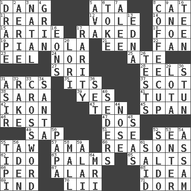 ACROSS 1. Mild oath, euphamism for damn 5. "One Day ___ Time" 8. Domesticated feline 11. Hitchcock's "____ Window" 12. Short-tailed, large-bodied rat 14. Single 15. Nick name for Arthur 17. Moved through 18. Enemy 19. Player piano 21. Car or cant ending 22. Avid follower 23. Snakelike fish 24. Not either 25. Had dinner 27. Indian title of respect (Mr.) 28. Snakelike fish 31. Curves 35. ___ a Wonderful Life 37. Highlander 38. "Two Mules for Sister ____" 39. Affirmative reply 41. Ballerina skirt 42. Image 43. Nine, plus one 45. Connect, as a bridge 46. Repose 47. Two (Sp.) 49. Plant excrement 51. Compass dir. 52. Ocean 55. The 23rd letter of the Hebrew alphabet 57. Housemaid (var.) 60. Thinks logically 62. Wedding promise 63. Insides of hands 65. Table seasonings 66. For each 67. Having or resembling wings 68. It may be bright or harebrained 69. Working for oneself (abbr.) 70. Cards in a Roman deck? 71. Dormintory (informal) DOWN 1. Window treatment 2. Nest on high 3. Relating to or accompanying birth 4. Smile widely 5. Actress Gardner 6. Casino tip 7. Toward shelter 8. Java holder (2 wds.) 9. Small Philippine buffalo 10. Adolescent 13. Pulitzer Prize-winning author Ferber 16. Immeasurably long periods of time 17. Noteworthy scarcity 20. Australian parrot (variant) 26. Trials 29. Globular water bottle used in Asia 30. Surprise greatly 31. SW Saudi Arabia district 32. Libertine 33. What you're doing now 34. Before Barbara or Clara 36. Arrange properly for use 40. Spring feasts 44. Sense of smell 48. Oceans 50. Dad 52. Twentieth part of a lira 53. Keyboard key 54. Indian state 55. Native american tent (variation) 56. An important port of Yemen 58. Shopping center 59. Jai _ 61. Expressed in words 64. Medical imaging device (abbr.)