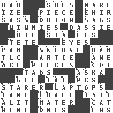 ACROSS 1. Soap unit 4. "______ My Girl" (Turtles hit) 8. Female horse 12. Ending with capital 13. Part 14. Independent ruler or chieftain 15. Backtalk 17. Greek mythologigal hunter 18. Droops 19. Fools 21. Hyrax 23. Pass on 24. R.R. building 26. French article 27. Wig 28. Sight organs 30. Baking dish 31. Turn aside suddenly 34. Prohibit 37. Affectionate concern, for short 38. Nick name for Arthur 39. A saturated hydrocarbon 40. Adept person 41. Parts 42. Small bed 43. Small amounts or degrees 44. "____ silly question..." 46. Set 47. Make lace 50. Personal Computers (abbr.) 51. A viewer who gazes fixedly 54. Portable computers 57. Docile 58. Peak District village in England 60. Jacques of French films 62. Came down and settled, as after flight 63. Mother 64. Feline 65. French philosopher Descartes 66. Washington bills 67. Followers of ems DOWN 1. Again 2. Muslim summons to prayer 3. Home 4. Fathers 5. Robbery 6. Environmental prefix 7. Post 8. Makes clutter 9. Collect or gather 10. Swiss mountan, "Queen of the Mountains" 11. Celtic language 13. Luau course 16. In a ____ (agitated or irritated) 20. Born 22. Toward shelter 25. Nest on high 27. Baby powder 29. Jacques Cousteau's middle name 30. Parent Teacher Association (abbr.) 31. Stated 32. Take or capture by force 33. And so on (abbr.) 34. Keyboard key 35. Small Philippine buffalo 36. Fish or hair follower 41. Light colored 43. Cigar-shaped 44. Fitting 45. Native of Scotland 46. Homeless child 48. Having winglike extensions 49. Falsehoods 51. Play the lead 52. Falsehood 53. San ____ (Riviera town) 55. For each 56. Comedian Laurel of Laurel & Hardy 59. Daniel's nick name 61. It is