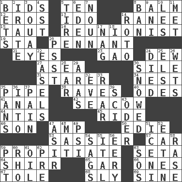 ACROSS 1. Auction offers 5. Nine, plus one 8. Lip ointment 12. Greek god of love 13. Wedding promise 14. Indian princess (variant) 15. Tense 16. One who advocates reunion 19. R.R. building 20. Pre-World Series prize 21. Snake ____ (dice throw) 23. E Mali city 24. Morning condensation 27. At sea 30. Drop; flow; fall 31. A viewer who gazes fixedly 34. A home for chicks 35. Corncob 38. All-night dance parties 40. Lyric poems 41. Of or related to the anus 42. Manatee 44. Nuclear Threat Initiatives 45. Travel on or in a vehicle 46. Boy, to dad 47. Electrical Unit 50. Singer Brickell 53. More disrespectful 57. Auto 59. Appease 63. Stalk of a moss capsule 64. Bake eggs in their shells 65. Slender fish 66. Singles 67. Lacquered or enameled metalware 68. Playfully artful 69. Trig term DOWN 1. Antes 2. Feeling or showing extreme anger 3. A city in N France, SE of Calais 4. Fast jet (abbr.) 5. Hoop that covers a wheel 6. Paradise 7. Part of speech 8. Bar 9. Black tropical American cuckoo 10. French article 11. Was introduced to 14. Printing process, for short 17. Tired old horse 18. _ tizzy (2 wds.) 20. Inconspicuous attention getter 22. Artist's stands 24. Passed on 25. Otherwise 26. Soaks 28. Ewer handle 29. Caspian sea tributary 30. Frozen precipiation fell 32. First lady 33. Located in or toward the back 35. Baking dishes 36. To the inside or interior of 37. Ache 39. _-fi 43. River in Europe 47. SW Saudi Arabia district 48. Floor protector 49. 23rd letter of the Greek alphabet 51. Ancient Celtic tribe of eastern Britain 52. Eroded 54. Droops 55. Slanted text style (abbr.) 56. Suggestive of the supernatural 58. To erase 59. Pacific Standard Time (abbr.) 60. 17th letter of the Greek alphabet 61. Petroleum 62. Before (prefix) 63. Mayday