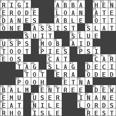 ACROSS 1. Swiss mountan, "Queen of the Mountains" 5. Swedish rock group 9. Layer 12. Eat (away) 14. Grant temporary use of 15. Had dinner 16. Natives or inhabitants of Denmark 17. Competent 18. Baseball player Mel 19. Single 20. Help 23. Narrow board 24. Set or collection 25. Turn sharply 27. United States Postal Service (abbr.) 30. Crowd into 32. Help 33. A blast of a horn 34. Sliced desserts 36. 23rd letter of the Greek alphabet 38. Greek goddess of the dawn 39. Domesticated feline 40. Automobile 43. Label 46. Volcanic refuse 48. Tenth: prefix 49. Small child 51. Period 52. Wrote a lyric poem 53. "Silly old bear" 54. Inactive volcano in Sicily 56. Lip ointment 58. Main course 61. Morning condensation 64. Australian flightless bird 65. One who makes use of a thing 66. Lacking in sense or substance 68. Erode 69. Mediterranean tributary 70. Titled peers of a realm 71. 17th letter of the Greek alphabet 72. Small island 73. State of inaction DOWN 1. Redecorate 2. SW Asia republic 3. Went 4. Binary compound 5. Jai _ 6. Moves up and down 7. Greek mezzo-soprano Agnes 8. A saturated hydrocarbon 9. White Person, in Hawaii 10. Singer James 11. Remaining after all deductions 13. Son of Isaac 21. Simple or foolish person 22. Unemotional ones 23. Beer foam 24. Fast jet (abbr.) 26. Mouth edge 27. Shoshoni 28. "Barney Miller" actor Jack 29. Mail 31. Memphis, Tenn. Street 35. A viewer who gazes fixedly 37. On the rocks 41. Adept person 42. To free from 44. Smallest unit of an element 45. Thick or sticky substance 47. Yard entry 48. ___ good deed 50. College paper 53. Cartoon dog 55. Famous astronaut Armstrong 56. Fermented drink made from hops 57. Wet nurse 59. 1994 drama film starring Jodie Foster 60. Family _ (genealogy) 61. Have the gumption 62. Conclusions 63. Compass direction 65. Single; one (prefix) 67. And not