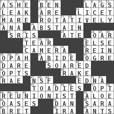 ACROSS 1. American tennis player Robert 5. Benjamin's nick name 8. Fails to keep up a pace 12. Path through which fluid escapes 13. "We ___ not amused" (Victoria) 14. It is permitted: Lat. 15. Female horse 16. Rotating or pertaining to rotation 19. Santa ___, CA 20. Refrain by choice 21. Indian titles of respect 23. Had dinner 24. Rowing implement 27. Lacerate 30. Otherwise 31. Device for capturing images 34. It's straight from the horse's mouth 35. Brightly colored fish 38. Remain 40. Legendary monster 41. Have the gumption 42. Flew 44. Chooses 45. Immoral or dissolute person 46. Actress Charlotte 47. Science/research agcy. 50. Pulitzer Prize-winning author Ferber 53. Sycophants 57. Elect 59. One who advocates reunion 63. _ vera 64. Fertile tracts in a desert 65. One of the 12 tribes of Israel 66. "Two Mules for Sister ____" 67. Cy Young winner Saberhagen 68. Lyricist Gershwin 69. Pismires DOWN 1. _ mater 2. Seines 3. Ethiopian city, capital of Harari 4. Supplement with great effort 5. Sharp remark 6. Greek god of love 7. Remaining after all deductions 8. 54 in ancient Rome 9. Adept person 10. Set 11. Filthy place 14. Actor's bit 17. American Automobile Association (abbr.) 18. Teat (slang) 20. At sea 22. Irritating cutaneous sensations 24. Cassini of fashion 25. SW Saudi Arabia district 26. French philosopher Descartes 28. Wet nurse (var.) 29. Confederate soldiers (slang) 30. Eaten away 32. River (Sp.) 33. The sixth month of the Jewish calendar 35. Aroma 36. Dad 37. Johnson of "Laugh-In" 39. Epoch 43. Supplements with great effort 47. Nuclear Threat Initiatives 48. "Barney Miller" actor Jack 49. Avid follower 51. Pitcher Ryan 52. To the left, to Queeg 54. "You Light Up My Life" star Conn 55. Austrian river, tributary to the Danube 56. Inactive volcano in Sicily 58. Beverages made from leaves 59. Director Reiner 60. Hearing organ 61. Purpose 62. Fish or hair follower 63. White ___ sheet