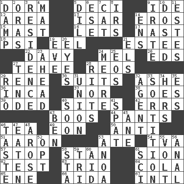 ACROSS 1. Dormintory (informal) 5. Tenth: prefix 9. Binary compound 12. Length times width 13. Austrian river, tributary to the Danube 14. Greek god of love 15. Vertical spar for supporting sails 16. Allows 17. Political cartoonist Thomas 18. 23rd letter of the Greek alphabet 19. Snakelike fish 21. First name in cosmetics 22. American folk hero Crockett 24. Cartoonist voice _ Blanc 26. Begley and Asner 27. Giggle 28. Vintage cars 29. French philosopher Descartes 30. Sets or collections 32. American tennis player Robert 36. South American Indian 37. And not 38. Travels 39. Wrote a lyric poem 40. Settings 42. Blunders 43. Expressions of contempt or scorn 44. Leg coverings 46. Beverage made from leaves 49. Period of immesurable duration 50. Opposed to 51. Composer Copland 53. Had dinner 54. Federal power corp. 57. Cease 58. Comedian Laurel of Laurel & Hardy 61. The Jewish people; Israel 62. Trial 63. Musical group of three 64. Root beer relative 65. Compass dir. 66. Opera by Verdi 67. International (abbr.) DOWN 1. Moist 2. Mouths or openings 3. Dwelling 4. Floor covering 5. Deli pickle 6. Compass dir. 7. Feline 8. Big collection agency 9. Feeling or showing extreme anger 10. Administered medicine 11. _____ Park, CO 14. Followers of ems 19. First lady 20. Snake ____ (dice throw) 21. Raised railways 23. At or in the front 24. Distance measurement (Brit.) 25. Greek goddess of the dawn 27. Look after 28. Debaucheries 29. _ de Janeiro 31. The state of being joined or united 32. Representative 33. Determination 34. Possessive pronoun 35. Double-curved letter 40. "Barney Miller" actor Jack 41. Petty quarrel 43. Benjamin's nick name 45. A saturated hydrocarbon 46. Clothes sense 47. Eroded 48. Came up 52. Choose 53. Small Philippine buffalo 55. Electrical Unit 56. Of or related to the anus 58. R.R. building 59. Three (prefix) 60. Help 61. _-fi