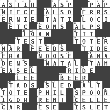 ACROSS 1. Being in motion 6. Cleo's killer 9. Infant food 12. Sibling's daughter 13. In addition 14. Blunders 15. Bert's buddy 16. Jacques of French films 17. Event scenes 18. And so on (abbr.) 19. Immeasurably long periods of time 20. High mountains 21. Rich soil 23. One more than two 24. Trial 25. Carrier 28. Make imperfect 30. Eats 34. Event that recurs at intervals 35. Period 36. Trap for birds or small mammals 38. Santa ___, CA 39. Hiding places for outlaws 41. Relating to or accompanying birth 43. Scottish cap 44. Artist's stand 46. Travel on an animal 48. Area sheltered from the wind 49. Fermented drink made from hops 50. Small amounts or degrees 51. Downhill vehicle 53. The first octave above the treble staff 56. Carryall 57. Silvers or Donahue 58. Soup utensil 60. Composer Stravinsky 61. Monthly bill 62. Cell (Danish) 63. Automobile 64. Compass dir. 65. Small island DOWN 1. A saturated hydrocarbon 2. Title for a man of rank and authority 3. Portable shelter 4. Ice on the eave 5. To separate or throw off 6. ____ Jay Lerner 7. Fast planes 8. Luau course 9. Appease 10. Arches 11. 23rd letter of the Greek alphabet 13. Smallest unit of an element 14. American author Paul (1891-1958) 19. Ingested 20. Small island 22. Order of Saint Francis (abbr.) 24. Interpreter 26. Pulitzer Prize-winning author Ferber 27. 480, 500 or 516 sheets of paper 28. Ancient Persian 29. Type of rug 31. Age 32. ___ good deed 33. Fast jet (abbr.) 37. Having ears or earlike features 40. Sowing specialist 42. Whopper 45. French article 47. Window treatments 49. Waist strap 50. Ancient Roman robe 51. "______ My Girl" (Turtles hit) 52. Actor's bit 54. Hang loosely or laxly 55. Lacquered or enameled metalware 56. Nervous spasm 57. Before (prefix) 58. _-fi 59. Fish or hair follower