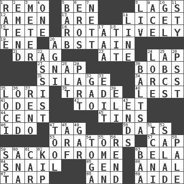 ACROSS 1. San ____ (Riviera town) 5. Benjamin's nick name 8. Falls behind 12. So be it 13. "We ___ not amused" (Victoria) 14. It is permitted: Lat. 15. False hair 16. Producing rotation 19. Compass dir. 20. Choose not to consume 21. To draw with force 23. Had dinner 24. Infant locale 27. Fastener 30. Moves up and down 31. Fodder prepared in a silo 34. Curves 35. Australian parrot (variant) 38. Buy and sell 40. For fear that 41. Lyric poems 42. Bathroom plumbing fixture 44. Penny 45. Metal containers 46. Wedding promise 47. Label 50. Raised platform 53. Speakers 57. Head covering 59. Italian handbag shop? 63. Actor Lugosi 64. Slow-paced one 65. Commissioned military rank (abbr.) 66. Of or related to the anus 67. Canvas cover 68. Plus 69. Helper DOWN 1. Pace 2. Make improvements or corrections to 3. Distance measurement 4. Single 5. Sharp remark 6. Greek god of love 7. Remaining after all deductions 8. 54 in ancient Rome 9. Adept person 10. Set 11. Filthy place 14. Actor's bit 17. American Automobile Association (abbr.) 18. Teat (slang) 20. Hindu god of fire 22. Help 24. Old wives' tales, e.g. 25. Lettered men learn these first 26. Inconspicuous attention getter 28. The first octave above the treble staff 29. Role in a play 30. Greek mezzo-soprano Agnes 32. E Mali city 33. Prepare for publication 35. Locales 36. Wrote a lyric poem 37. Former U.S. Attorney General Janet 39. Connecticut Ivy Leaguer 43. Conclusions 47. Instrument 48. Sandy's bark 49. Slender fish 51. Ancient Celtic tribe of eastern Britain 52. Vegetable dish 54. Ancient Roman robe 55. Sign of things to come 56. Tear apart 58. Diluted with white 59. Fast jet (abbr.) 60. Santa ___, CA 61. Auto 62. Monetary unit of Laos 63. Sound made by sheep