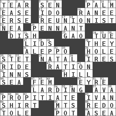 ACROSS 1. Separate forcefully 5. Elected rep. 8. Inside of hand 12. Comfort 13. Wedding promise 14. Indian princess (variant) 15. Celtic language 16. One who advocates reunion 19. Teachers' org. 20. Pre-World Series prize 21. Food container 23. E Mali city 24. Third day of the wk. 27. Hats (slang) 30. Those people 31. City in Syria 34. Opening into or through something 35. Proofreading order 38. Relating to or accompanying birth 40. Angers 41. Travel on or in a vehicle 42. Food allowance for one day 44. Taverns 45. Land elevation 46. Ocean 47. Opposite of masc. 50. Jane of fiction 53. Preparing or cooking with lard 57. Actress Gardner 59. Appease 63. "Terrible" tsar 64. Upper-body garment 65. Mountains (abbr.) 66. Redecorate 67. Lacquered or enameled metalware 68. Plant holder 69. At sea DOWN 1. Adolescent 2. Having ears or earlike features 3. Slender Brazilian palm 4. Portuguese money of account (variant) 5. Beget 6. Locale of original sin 7. Part of speech 8. Baking dish 9. Cuckoo 10. French article 11. Was introduced to 14. Printing process, for short 17. Tired old horse 18. _ tizzy (2 wds.) 20. Silvers or Donahue 22. Chalkboards 24. Son of Odin 25. Ubangi River tributary 26. Snake ____ (dice throw) 28. Lair 29. Coast Guard woman 30. Without viscosity 32. Parent Teacher Assoc. 33. Pledge 35. Indian titles of respect 36. Prong on a fork 37. Pulitzer Prize-winning author Ferber 39. Cards in a Roman deck? 43. Cassini of fashion 47. Secret move to avoid paying debts 48. Consume 49. Medical imaging device (abbr.) 51. All-night dance parties 52. Elude 54. Moist 55. "Tell ____ the Marines!" 56. Egg locale 58. Small Philippine buffalo 59. Pacific Standard Time (abbr.) 60. 17th letter of the Greek alphabet 61. Petroleum 62. Before (prefix) 63. Retirement account (abbr.)