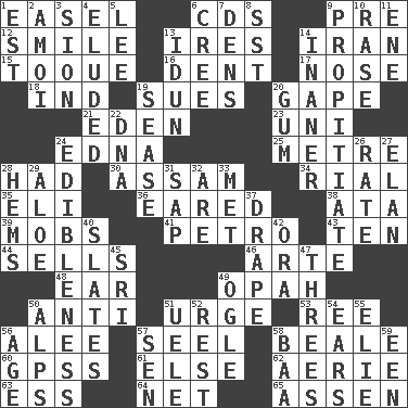 ACROSS 1. Artist's stand 6. Music discs 9. Before (prefix) 12. Grin 13. Angers 14. SW Asia republic 15. Woman's close-fitting hat 16. Scratch 17. Characteristic smell of wine 18. Working for oneself (abbr.) 19. Institutes legal proceedings 20. Yawn 21. Genesis locale 23. Single; one (prefix) 24. Pulitzer Prize-winning author Ferber 25. Distance measurement (Brit.) 28. Possessed 30. Indian state 34. Monetary unit of Yemen 35. Connecticut Ivy Leaguer 36. Having ears or earlike features 38. _ moment's notice (2 wds.) 39. Disorderly crowds 41. Stone: prefix 43. Nine, plus one 44. Makes a sale 46. Johnson of "Laugh-In" 48. Hearing organ 49. Brightly colored fish 50. Against 51. Goad 53. To riddle 56. Toward shelter 57. Sew up the eyelids of hawks and falcons 58. Memphis, Tenn. Street 60. Global Positioning Systems (abbr.) 61. Otherwise 62. Nest on high 63. Curvy letter 64. Fish or hair follower 65. NE Netherlands city DOWN 1. Eastern Standard Time (abbr.) 2. Mine, in Marseilles 3. The Jewish people; Israel 4. Evaded 5. Area sheltered from the wind 6. Algonquian 7. Habitations of wild animals 8. Fast jet (abbr.) 9. Appease 10. Raze (variant) 11. Compass dir. 13. Goddess of spring and wife of Bragi 14. More lacking in sense or substance 19. Gospel singer Marvin 20. Chewing product 22. Heredity factor (abbr.) 24. The property of being fit to eat 26. Pace 27. Style 28. Cloth borders 29. Medicinal plant 31. Plant excrement 32. "We ___ not amused" (Victoria) 33. Was introduced to 37. Window treatment 40. Chalkboards 42. Mouth or opening 45. _ Lanka 47. Threesomes 49. Stare at amorously 50. High mountains 51. Ubangi River tributary 52. Remainder 54. Hearing organs 55. Writer Wiesel 56. Mature 57. Elected rep. 58. Sound made by sheep 59. Car or cant ending