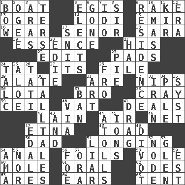 ACROSS 1. Water vessel 5. Armor plate that protects the chest 9. Libertine 13. Legendary monster 14. Farming town in central California 15. Independent ruler or chieftain 16. Erode 17. Sir (Sp.) 18. "Two Mules for Sister ____" 19. Center 21. Part of HMS, perhaps 22. Prepare for publication 23. Groovy apts. 24. Make lace 27. ___ a Wonderful Life 28. Do some clerical work 29. Having winglike extensions 31. "We ___ not amused" (Victoria) 32. Pinches, bites 36. Globular water bottle used in Asia 37. Sis' sibling 38. Supercomputer manufacturer 39. To provide with a ceiling 40. Large container 41. Allots cards 42. (Had) reclined 44. Wind 46. Fish or hair follower 47. Inactive volcano in Sicily 48. Frog relative 50. June honoree 51. Yearning 54. Of or related to the anus 56. Fencing necessities 58. Short-tailed, large-bodied rat 60. Undercover agent 61. Of the mouth 62. Lyric poems 63. Ancient Greek god of war 64. Hearing organs 65. Portable shelter DOWN 1. Arrow shooter 2. Double curve, resembling the letter S 3. Ancient river in northeast Turkey 4. Laconic 5. Chooses 6. Went 7. Wedding promise 8. Title for a knight 9. Home 10. Collect or gather 11. Apertif with cassis 12. Epoch 17. In a ____ (agitated or irritated) 20. Singer Brickell 21. Actor Linden 23. Sliced dessert 24. Baby powder 25. Medicinal plant 26. Jacques of French films 28. Away 30. Baron Munchausen's specialties 31. Nonscientific branch of learning 33. SW Asia republic 34. Light colored 35. System (abbr.) 37. Forbid 40. By way of 41. To draw with force 43. Plus 44. Ringlike coral islands and reefs 45. Charged atoms 47. Peak District village in England 49. A piece of turf (Scot.) 51. One who doesn't tell the truth 52. Thickened enlargement 53. Small, secluded valley 54. Housemaid (var.) 55. Or not 56. Enemy 57. Mouth or opening 59. Eastern Standard Time (abbr.)