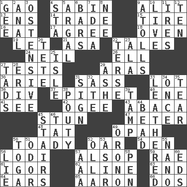 ACROSS 1. E Mali city 4. Unit of acoustic absorption 9. Came down and settled, as after flight 13. Followers of ems 14. Buy and sell 15. Hoop that covers a wheel 16. Consume 17. Match 18. Baking chamber 19. Allow 21. White ___ sheet 22. Lies 24. Famous astronaut Armstrong 26. Pipe bend 27. Trials 29. Caspian sea tributary 30. Satellite of Uranus 31. Backtalk 33. Car dealer's back yard 36. HTML Container Element 37. Curse 40. Compass dir. 41. Observe 42. Double curve, resembling the letter S 43. Phillipine bananalike plant 45. Surprise greatly 47. Distance measurement 48. Make lace 49. Brightly colored fish 50. Sycophant 52. Boat paddle 54. Lair 56. Farming town in central California 57. Columnist Joseph or Stewart 59. Actress Charlotte 61. Russian composer Stravinsky 62. Place in a line 63. Conclude 64. Hearing organs 65. Composer Copland 66. Two (Sp.) DOWN 1. Unit of force equal to gravity 2. Of or related to the anus 3. Clearly or manifestly demonstrative 4. R.R. building 5. Therefore, facetiously 6. Soap units 7. The content of cognition 8. Born 9. Ringlike coral islands and reefs 10. Moving, as bait 11. Angers 12. Nine, plus one 20. False hair 22. Laconic 23. Insect wing 25. Small island 27. Small boys 28. 4th largest of the Great Lakes 29. American tennis player Robert 31. Omen 32. Had dinner 33. Resembling or made to resemble leather 34. At one time in the past 35. Lacerate 38. Inclined to pout 39. Pack (down) 44. Necklace unit 45. Flight of steps 46. Bit 49. U. of Maine site 50. Ancient Roman robe 51. Aroma 52. Spanish pot 53. SW Saudi Arabia district 55. Billionth: prefix 56. Falsehood 57. American Automobile Association (abbr.) 58. Animal enclosure 60. Begley and Asner