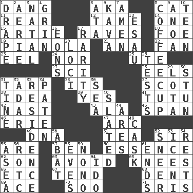 ACROSS 1. Mild oath, euphamism for damn 5. Alias (abbr.) 8. Feline 11. Rump 12. Not wild 14. Single 15. Nick name for Arthur 17. All-night dance parties 18. Enemy 19. Player piano 21. Santa ___, CA 22. Avid follower 23. Snakelike fish 24. Not either 25. Shoshoni 27. _-fi 28. Snakelike fish 31. Canvas cover 35. It is 37. Highlander 38. The main thing one is thinking about 39. It is so 41. Ballerina skirt 42. Political cartoonist Thomas 43. Chicken ___ king 45. Connect, as a bridge 46. 4th largest of the Great Lakes 47. Curve 49. Heredity factor (abbr.) 51. Beverage made from leaves 52. Title for a knight 55. "We ___ not amused" (Victoria) 57. Benjamin's nick name 60. Substance 62. Manchild 63. Prevent from happening 65. Leg joints 66. And so on (abbr.) 67. Watch over 68. Gouge 69. Adept person 70. "Barney Miller" actor Jack 71. Indian titles of respect DOWN 1. Window treatment 2. Nest on high 3. Brizilian seaport 4. Smile widely 5. "One Day ___ Time" 6. Polynesian shrub of the pepper family 7. So be it 8. Java holder (2 wds.) 9. Small Philippine buffalo 10. Adolescent 13. He sold his birthright 16. Immeasurably long periods of time 17. Noteworthy scarcity 20. Locales 26. Trials 29. Globular water bottle used in Asia 30. Astound 31. Prong on a fork 32. The sixth month of the Jewish calendar 33. Dwelling 34. Eucharist need 36. Ocean 40. Scheduled 44. Ancient Greek god of war 48. Keg 50. Blind as ____ 52. Contemptuous expression 53. Ancient Celtic tribe of eastern Britain 54. Musical pauses 55. Toward the sea 56. College mil. group 58. Nights before holidays 59. Words to Nanette 61. Conclusions 64. Wedding promise
