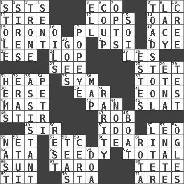 ACROSS 1. Fast planes 5. Environmental prefix 8. Affectionate concern, for short 11. Become fatigued 12. Chops off 14. Boat paddle 15. U. of Maine site 17. Greek god of the underworld 18. Adept person 19. Small, flat, pigmented spot on the skin 21. Air pressure measure (abbr.) 22. Color 23. Compass dir. 24. Chop off 25. French article 27. Observe 28. Proofreading order 31. Pile 35. Symbol (abbr.) 37. Haul 38. Celtic language 39. Ewer handle 41. Immeasurably long periods of time 42. Vertical spar for supporting sails 43. Baking dish 45. Narrow board 46. Use a spoon 47. Director Reiner 49. Title for a knight 51. Wedding promise 52. Lion 55. Fish or hair follower 57. And so on (abbr.) 60. Pulling apart 62. "One Day ___ Time" 63. Morally degraded 65. "_____ Recall" 66. Player for Phoenix 67. Pacific island yam 68. False hair 69. Teat (slang) 70. R.R. building 71. Ancient Greek god of war DOWN 1. Fur scarf 2. Begets 3. Marketplace scale 4. Transmitted 5. Pipe bend 6. Overturn; upset 7. Elects 8. Inedible or poisonous agaric 9. Made of lace 10. Algonquian 13. The visible part of the earth's surface 16. Petroleums 17. Wimpy's pal 20. Leaves 26. _____ Park, CO 29. Inactive volcano in Sicily 30. Trial 31. Equivocates 32. Part of Q.E.F. 33. Helper 34. _ dish (used to culture cells) 36. Atlas unit 40. Noteworthy scarcity 44. Thickened enlargement 48. Water vessel 50. Remainder 52. 61 cubic inches 53. Related on the mother's side 54. Stares at amorously 55. Political cartoonist Thomas 56. Needle holder 58. Beverages made from leaves 59. Sure thing 61. Round or rotation of duties 64. ___ good deed