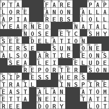 ACROSS 1. Parent Teacher Association (abbr.) 4. Conductor's collection 8. Infant food 11. Old wives' tales, e.g. 13. Soon (poet.) 14. Silent film actress Nazimova 15. Capital of Western Samoa 16. Confederate soldiers (slang) 17. Hang loosely or laxly 18. Had a strong desire 21. Relating to or accompanying birth 22. Characteristic smell of wine 23. And so on (abbr.) 25. Like a shrinking violet 26. Perceive with the eye 29. Conveyance 32. Laconic 34. Player for Phoenix 35. Single 38. In addition 39. Nick name for Arthur 41. Immeasurably long periods of time 43. Ocean 44. Luau accessory 45. Evade 46. Newsperson 50. Male child 51. Small drink 54. Curvy letter 55. Possessive pronoun 57. Go after with the intent to catch 59. Heighten or intensify 63. Compass direction 64. Actor Alda or Thicke 67. Tiny particle 68. Singer James 69. Famous astronaut Armstrong 70. Jacques of French films 71. To separate or throw off 72. Rowboat 73. Car dealer's back yard DOWN 1. Live dramatic performance 2. Drink excessively 3. Roberta Peters solo 4. Pack 5. A saturated hydrocarbon 6. Director Reiner 7. Followers of ems 8. Schemes 9. Assad's deity 10. Friendly 12. Merit 14. In the manner of 19. Thickened enlargement 20. Compass dir. 21. Non-commissioned officer (abbr.) 23. Needle case 24. Prong on a fork 26. R.R. building 27. Snakelike fish 28. Celtic language 30. Being in motion 31. Christmas carol 33. Fly high 36. Horse sense 37. Inside; within (prefix) 39. High mountains 40. Vintage cars 42. Elected rep. 45. Blunders 47. Snakelike fish 48. Without force or sincere effort 49. Car or cant ending 51. Bull 52. Feeling or showing extreme anger 53. Thick mixture 56. Argument over a trivial matter 58. Call ___ day 60. Slanted text style (abbr.) 61. Printing process, for short 62. Give off 64. Added to 65. Lion 66. Wind