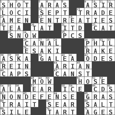 ACROSS 1. Went for two points 5. Caspian sea tributary 9. SW Saudi Arabia district 13. Venues 14. Back-to-school mo. 15. Buy and sell 16. So be it 17. Pleas 19. Afternoon social gathering 20. Make lace 21. It would 22. Feline 23. Frozen precipitation 25. Personal Computers (abbr.) 26. Lessep's creation 30. Silvers or Donahue 34. 1973 Nobel Price Winner (Physics) Leo 35. Libertine 36. "____ silly question..." 39. An organ shaped like a helmet 42. Lyric poems 43. It's straight from the horse's mouth 44. Believer in; advocate of (suffix) 46. Smile enhancers 47. 2nd pers. sing. pres. of can (arch.) 48. Cut the grass 51. Stockings 54. According to 57. Ewer handle 58. Frozen water 60. Music discs 62. Unrelated to defense, as in spending 65. Pate de foie ____ 66. Distinguishing feature 67. Wither 68. Table seasoning 69. Drop; flow; fall 70. Small pie 71. Eons DOWN 1. Narrow board 2. Dwellings 3. Sea 4. Shallow baking pan 5. Toward the sea 6. Monthly bill 7. Fitting 8. Long narrow piece of something 9. Nonscientific branch of learning 10. Ketch in the Levant 11. The content of cognition 12. Remainder 15. Small boys 18. And so on (abbr.) 20. It was, poetically 24. Seas 27. Tired old horse 28. Alias (abbr.) 29. Pale purple color 30. Right away 31. Possessed 32. D.D.E's nickname 33. French article 36. Curve 37. Ocean 38. Sleep 40. Period 41. The 18th letter of the Arabic alphabet 45. American tennis player Robert 48. Rendezvous 49. Clumsy lout 50. Obtain by seizing forcibly or violently 52. Strangle with an iron collar 53. Peak District village in England 54. Pismires 55. Australian parrot (variant) 56. Of or related to the anus 58. Austrian river, tributary to the Danube 59. Certainty 61. Fast planes 63. Expire 64. Teachers' org. 65. Girls' org. (abbr.)