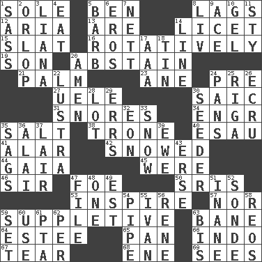 ACROSS 1. Flatfish 5. Benjamin's nick name 8. Falls behind 12. Roberta Peters solo 13. "We ___ not amused" (Victoria) 14. It is permitted: Lat. 15. Narrow board 16. Rotating or pertaining to rotation 19. Male offspring 20. Choose not to consume 21. Inside of hand 23. A saturated hydrocarbon 24. Before (prefix) 27. Ubangi River tributary 30. Ketch in the Levant 31. Sounds asleep 34. Engineer (abbr.) 35. Table seasoning 38. Marketplace scale 40. Son of Isaac 41. Having or resembling wings 42. Frozen precipiation fell 44. Greek goddess of the earth (variant) 45. Past tense of be (plural) 46. Title for a knight 47. Enemy 50. Indian titles of respect 53. Motivate 57. Not either 59. Supplementary 63. Object of repulsion 64. First name in cosmetics 65. Baking dish 66. _ china 67. Separate forcefully 68. Compass dir. 69. Perceives with the eye DOWN 1. Backtalk 2. Lowest deck of a ship 3. Woody, climbing, usually tropical plant 4. Erode 5. Sharp remark 6. Greek god of love 7. Remaining after all deductions 8. 54 in ancient Rome 9. Adept person 10. Set 11. Filthy place 14. Actor's bit 17. Auto club (abbr.) 18. Metal container 20. So be it 22. A period of five years 24. Baking dishes 25. Port city in Latvia 26. Shade of tan 28. Car dealer's back yard 29. Blunders 30. Sowing specialist 32. Period of immesurable duration 33. Overwhelm 35. Settles 36. Jai ____ 37. Den 39. She-sheep 43. Celtic language 47. Do some clerical work 48. Single 49. Eastern Standard Time (abbr.) 51. Silly 52. Something which is sent 54. Corncob 55. "Terrible" tsar 56. French philosopher Descartes 58. Vintage cars 59. Put into a specified state 60. Purpose 61. Parent Teacher Assoc. 62. For each 63. Twice