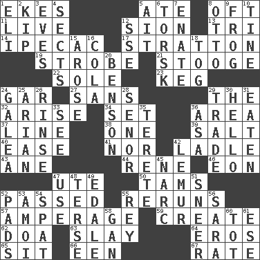 ACROSS 1. Makes supply last 5. Had dinner 8. Often (poetically) 11. Moving, as bait 12. The Jewish people; Israel 13. Three (prefix) 14. Medicinal drug used to evoke vomiting 17. Ski resort town in Vermont 19. Disco prop 21. Moe Howard, for one 22. Not divided or shared with others 23. Cask 24. Slender fish 27. Without 29. Definite Article 32. Get up 34. Arrange properly for use 36. Type of rug 37. Actor's bit 38. Single 39. Table seasoning 40. Comfort 41. And not 42. Dipping utensil 43. One (Scot) 44. French philosopher Descartes 46. Age 47. Shoshoni 50. Scottish caps 52. Went by 55. Summer TV shows 57. Electrical Measurement 59. Make 62. ___ good deed 63. Kill 64. Greek god of love 65. Be seated 66. Car or cant ending 67. Assign a rank or rating to DOWN 1. Connecticut Ivy Leaguer 2. Monetary unit of Laos 3. Nights before holidays 4. Religious groups 5. Small island 6. Cod relative 7. Related on the mother's side 8. Von Bismarck 9. Toadlike animal 10. Prong on a fork 12. Compass dir. 15. Came up 16. Root beer relative 18. Coat; cloak 20. Gillaume's butler role 24. An organ shaped like a helmet 25. Believer in; advocate of (suffix) 26. Remove soap 28. Sir (Sp.) 29. Exchange 30. Phone greeting 31. Consumed 33. Perceive with the eye 35. Cigar-shaped 36. White ___ sheet 42. Arboreal primate 45. Drug cop 47. Purpose 48. Laconic 49. Peak District village in England 51. Scornful expression 52. Writing tablets 53. Mine, in Marseilles 54. Petty quarrel 55. Marina Del _, California 56. "Two Mules for Sister ____" 58. Separate the seeds from cotton 60. Small child 61. Compass dir.