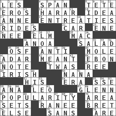 ACROSS 1. French article 4. Connect, as a bridge 8. Wig 12. Greek god of love 14. Ethiopian city, capital of Harari 16. The main thing one is thinking about 17. Queen of England 1702-14 18. Pleas 20. Amusement-park features 22. Automobile 23. Compass dir. 24. Born 25. Shade tree 28. Big _ 30. Small Philippine buffalo 31. First course 35. Order of Saint Francis (abbr.) 37. Opposed to 40. Undercover agent 41. The sixth month of the Jewish calendar 42. Intended 44. Inky black, to poets 45. Short letter 46. It was, poetically 47. To riddle 48. From or relating to Ireland 50. Grandmother 52. Part of HMS, perhaps 54. Period 55. Compass dir. 58. Santa ___, CA 61. Lion 63. American astronaut and politician John 65. Teen's desire 70. Type of rug 71. Arranges properly for use 72. Indian princess (variant) 73. Cy Young winner Saberhagen 74. Otherwise 75. Without 76. "We ___ not amused" (Victoria) DOWN 1. Memorize 2. Bert's buddy 3. Message 4. A female animal or person 5. Baking dish 6. Tate display 7. Drug cop 8. Teat (slang) 9. Singer Brickell 10. Adolescent 11. Comfort 13. Observe 15. 480, 500 or 516 sheets of paper 19. Caspian sea tributary 21. Elected rep. 26. Rich soil 27. French painter Edouard 29. Device for capturing images 30. Anew 32. Ear part 33. _ vera 34. Lair 35. Scent 36. Suttee (variant) 38. The 23rd letter of the Hebrew alphabet 39. Empty; void 41. Black tropical American cuckoo 43. Russian ruler of old 49. Land elevation 51. Tired old horse 53. Burn superficially 55. Spanish missionary in California 56. Scornful expression 57. Maternal 58. Domed church section 59. Christmas carol 60. Flats, for short 62. Mouths or openings 64. Experiment locale 66. Purpose 67. _ tizzy (2 wds.) 68. Nine, plus one 69. Affirmative reply