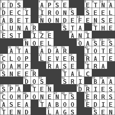 ACROSS 1. Begley and Asner 4. Domed church section 8. Inactive volcano in Sicily 12. Tenth: prefix 14. Metal shackles 16. Stitch closed the eyes of (a falcon) 17. Collude with 18. Unrelated to defense, as in spending 20. Type of eclipse 22. R.R. building 23. Definite Article 24. Eastern Standard Time (abbr.) 25. Ending with capital 28. Cuckoo 30. Christmas carol 31. Fertile tracts in a desert 35. _ moment's notice (2 wds.) 37. The sixth month of the Jewish calendar 40. Lug 41. Hoof sound 42. Crowbar 44. Assign a rank or rating to 45. Moist 46. Raze (variant) 47. Retirement account (abbr.) 48. Contemptuous expression 50. Baby powder 52. Two (Sp.) 54. _ Lanka 55. Sound made by sheep 58. Health resort 61. "___ Little Indians" 63. Frees from moisture 65. Pieces 70. Blunders 71. Toward the sea 72. Off limits 73. Singer Brickell 74. Be inclined (to) 75. Fails to keep up a pace 76. Elected rep. DOWN 1. Peak District village in England 2. Alight from a bus 3. Odor 4. The 18th letter of the Arabic alphabet 5. Adept person 6. Boy, to dad 7. Conclusions 8. Compass dir. 9. Portable shelter 10. Delicate 11. Toward shelter 13. Call ___ day 15. Bristle 19. Papal veil 21. _ de Janeiro 26. Ardor 27. A person who is older than you are 29. Of or pertaining to medicine 30. Slept 32. Fly high 33. Singer James 34. Observe 35. Actor Alda or Thicke 36. Heavy book 38. Actress Gardner 39. Musical pauses 41. Music discs 43. Located in or toward the back 49. Printing process, for short 51. Flaplike covering 53. Transmitted 55. Avian creatures 56. Nest on high 57. NE Netherlands city 58. Scram! 59. Airs 60. So be it 62. Actress Patricia 64. To riddle 66. Groovy apt. 67. Basketball assoc. 68. Coat; cloak 69. Mayday