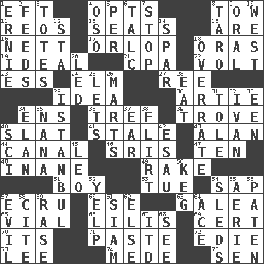 ACROSS 1. Lizard (obsolete) 4. Chooses 8. Pull behind 11. Vintage cars 13. Theater features 15. "We ___ not amused" (Victoria) 16. Remaining after all deductions 17. Lowest deck of a ship 18. Mouths or openings 19. Perfect 21. Accounting whiz (abbr.) 22. Electrical Unit 23. Curvy letter 24. Shade tree 27. Portuguese money of account (variant) 29. The main thing one is thinking about 30. Nick name for Arthur 34. Followers of ems 36. Unclean, religiously 39. Collection of objects 40. Narrow board 41. Showing deterioration from age 43. Actor Alda or Thicke 44. Lessep's creation 46. Indian titles of respect 47. Nine, plus one 48. Silly 49. Immoral or dissolute person 51. Male child 53. Third day of the wk. 54. Plant excrement 57. Shade of tan 60. Compass dir. 63. An organ shaped like a helmet 65. Small bottle 66. Ms. Damita and namesakes 69. Sure thing 70. ___ a Wonderful Life 71. Thick mixture 72. Singer Brickell 73. Area sheltered from the wind 74. Ancient Persian 75. Elected rep. DOWN 1. Bert's buddy 2. Gives food to 3. Lugs 4. Bear (Spanish) 5. For each 6. Baby powder 7. Discontinue 8. Edible starchy tuberous root 9. Taken by mouth 10. Compass direction 12. R.R. building 14. Coast Guard woman 18. Make much ado about nothing 20. Directed 25. Allows 26. Shops 28. Ingest 29. Byzantium, centuries later 31. Lacquered or enameled metalware 32. "Terrible" tsar 33. Car or cant ending 34. Enthusiasm 35. Grandmother 37. Ewer handle 38. Seductive woman who exploits men 40. _-fi 42. He sold his birthright 45. Lion 50. Cask 52. Sharp bark 54. Bobsleighs 55. Nest on high 56. Eucharist need 57. Tending to cause great harm 58. Quote 59. Raze (variant) 61. Thailand, formerly 62. Otherwise 64. Adept person 67. It would 68. Perceive with the eye