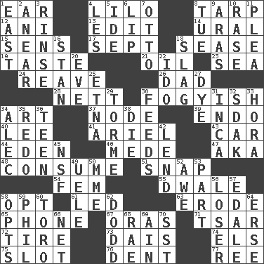 ACROSS 1. Hearing organ 4. _ and Stitch 8. Canvas cover 12. Cuckoo 13. Prepare for publication 14. Mountain range 15. Elected reps. 17. Back-to-school mo. 18. Gospel singer Marvin 19. Clothes sense 21. Lubricate 23. Ocean 24. Break or tear apart 26. Male parent 28. Remaining after all deductions 30. Out of fashion; old fashioned 34. Tate display 37. Thickened enlargement 39. Inside; within (prefix) 40. Area sheltered from the wind 41. Satellite of Uranus 43. Auto 44. Locale of original sin 46. Ancient Persian 47. Alias (abbr.) 48. Ingest 51. Fastener 54. Opposite of masc. 55. A sleeping potion; an opiate (poet.) 58. Elect 61. Directed 63. Wear away 65. Give a jingle 67. Mouths or openings 71. Russian ruler of old 72. Hoop that covers a wheel 73. Raised platform 74. Raised railways 75. Groove 76. Incision 77. Portuguese money of account (variant) DOWN 1. Compass direction 2. Approach 3. Remove soap 4. French article 5. Binary compound 6. Mouth edge 7. Von Bismarck 8. Third day of the wk. 9. Caspian sea tributary 10. To erase 11. Entreaty 16. Comedian Laurel of Laurel & Hardy 18. Volcanic refuse 20. Night before a holiday 22. Wedding promise 25. Inactive volcano in Sicily 27. Color 29. Singer Mel 30. Eats 31. South American Indian 32. Neighbor of Neb. 33. Israeli folk dance 34. Actor Baldwin 35. Do over again 36. Adolescent 38. Pass on 42. Grant temporary use of 45. Overdraft (abbr.) 49. Ubangi River tributary 50. Madame (abbr.) 52. Deep reverence 53. Component 56. Failure 57. Peak District village in England 58. Elects 59. Silvers or Donahue 60. "Corrida" creature 62. Texas town _ City 64. Celtic language 66. Fish or hair follower 68. Actress Charlotte 69. The 18th letter of the Arabic alphabet 70. Fast jet (abbr.)