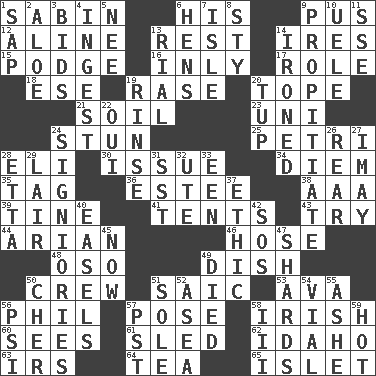 ACROSS 1. Unit of acoustic absorption 6. Part of HMS, perhaps 9. Fluid product of inflammation 12. Place in a line 13. Relief 14. Angers 15. Porridge 16. Inwardly 17. Hero or heavy, e.g. 18. Compass dir. 19. To erase 20. Drink excessively 21. Land 23. Corn or form start 24. Astound 25. _ dish (used to culture cells) 28. Connecticut Ivy Leaguer 30. Come out of 34. South Vietnam president (1954) 35. Label 36. First name in cosmetics 38. Auto club (abbr.) 39. Prong on a fork 41. Portable shelters 43. Attempt to accomplish something 44. Believer in; advocate of (suffix) 46. Flexible conduit 48. Bear (Spanish) 49. Food container 50. Ship's personnel 51. Ketch in the Levant 53. Actress Gardner 56. Silvers or Donahue 57. Airs 58. From or relating to Ireland 60. Observes 61. Downhill vehicle 62. Potato state 63. Big collection agency 64. Beverage made from leaves 65. Small island DOWN 1. Plant excrement 2. Medicinal plant 3. Auction offers 4. Eat 5. Born 6. Coop moms 7. Capri or Wight 8. Filthy place 9. Conciliate 10. Ubangi River tributary 11. Compass dir. 13. Monetary unit of Yemen 14. Pressed 19. Wash lightly 20. Uncastrated adult male sheep 22. Fr. "Yes" 24. Seigniories (variant) 26. Stern 27. "If ____ say so..." 28. Singer James 29. Den 31. Fast jet (abbr.) 32. Shoshoni 33. Car or cant ending 37. Moral principle 40. Artist's stands 42. Distress signal 45. At this time 47. Pottery fragments 49. Passed on 50. "Mermaids" star 51. Not divided or shared with others 52. Toward the sea 54. Small bottle 55. American tennis player Robert 56. 23rd letter of the Greek alphabet 57. Pacific Standard Time (abbr.) 58. One more than two 59. Being at a high temperature